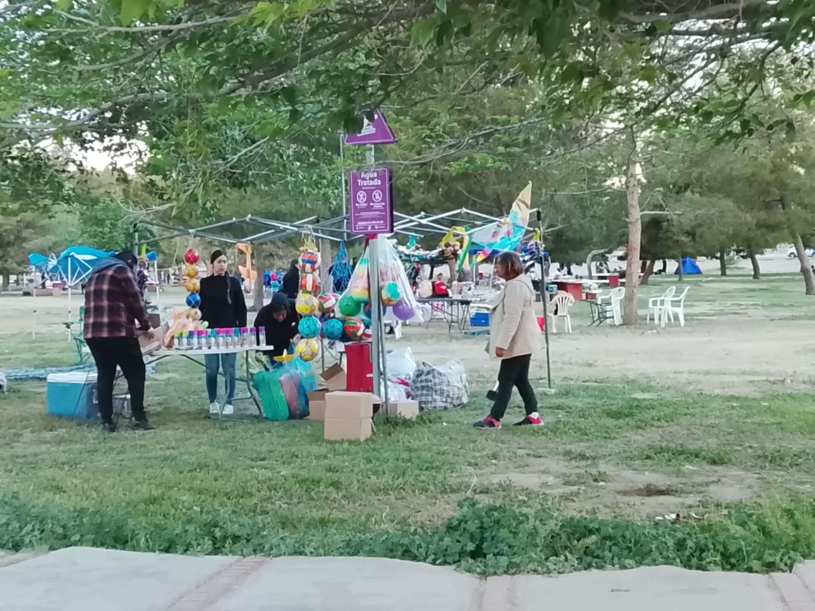 En el lugar también se observa la presencia de comerciantes ambulantes, quienes desde temprano se instalaron ofreciendo alimentos preparados, bebidas, así como artículos recreativos como globos, pelotas y juegos, contribuyendo al ambiente familiar que caracteriza esta celebración.