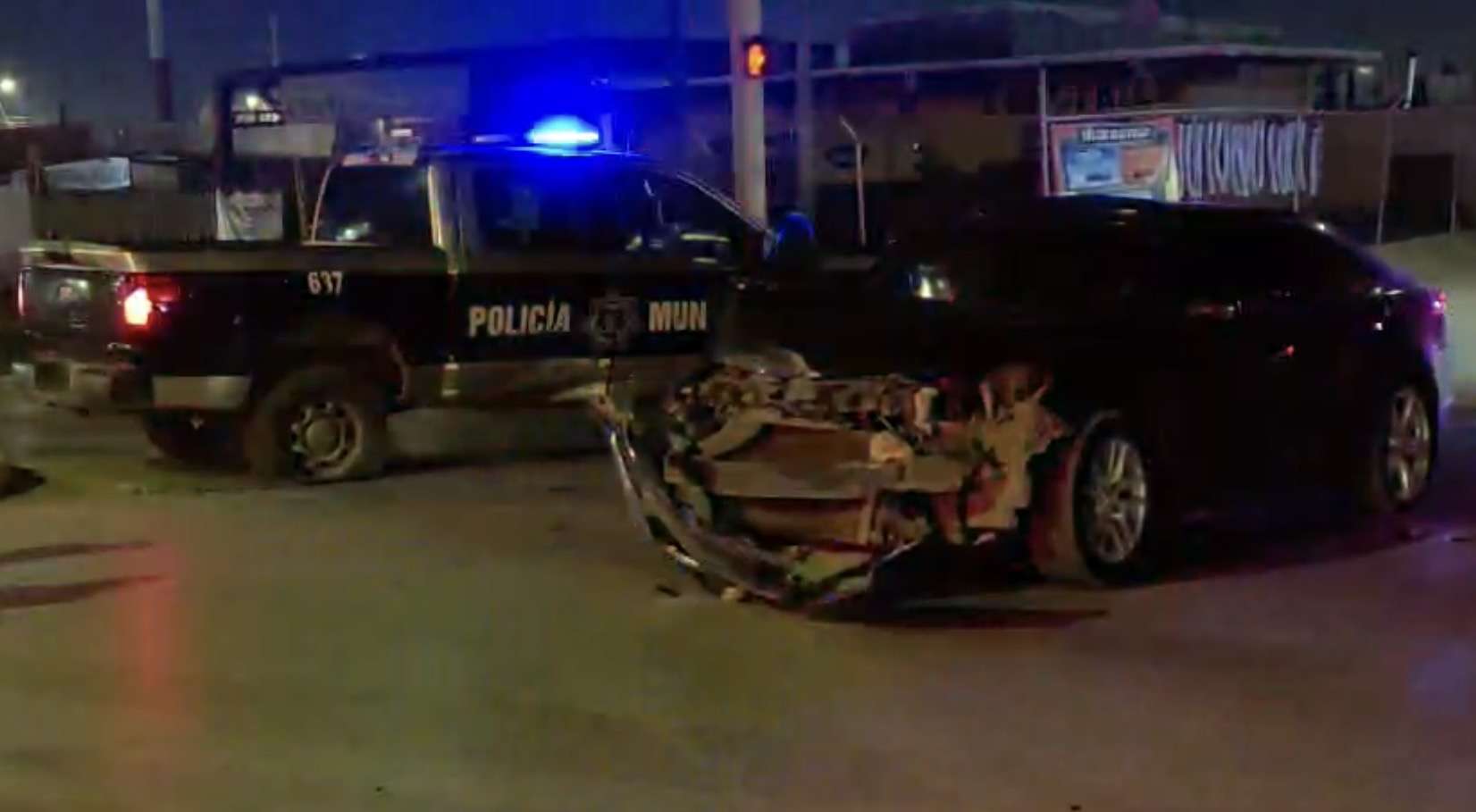 Ciudad Juárez.- Agentes de la Secretaría de Seguridad Pública Municipal se vieron involucrados en un accidente vial con un vehículo particular en el cruce de la calle Leona Vicario y bulevar Zaragoza.