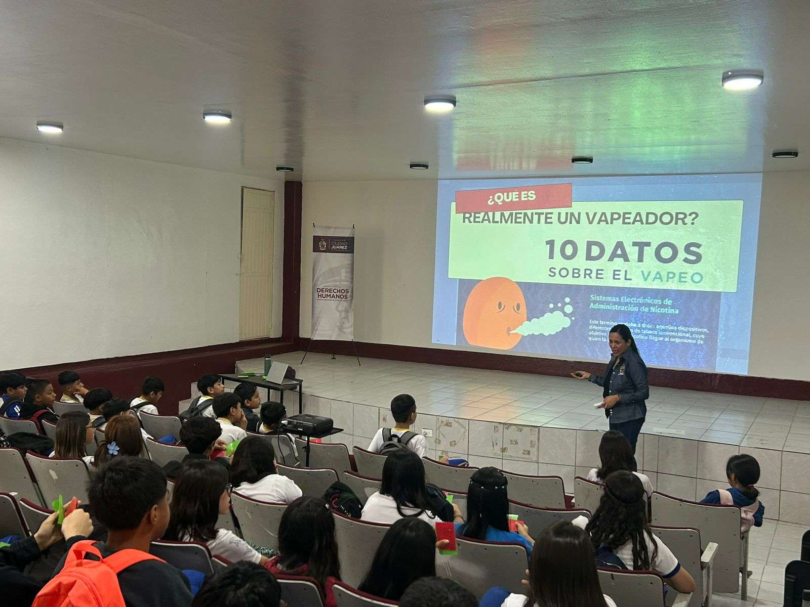 Ciudad Juárez.- El área de capacitación de la Dirección de Derechos Humanos acudió a la Escuela Secundaria Federal número 4, con el objetivo de compartir con el alumnado de ambos turnos la plática “Riesgos del uso de vapeadores en la adolescencia”.