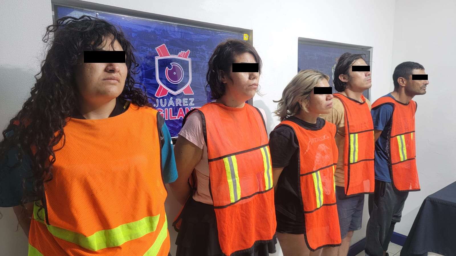 Ciudad Juárez .- Elementos de la Secretaría de Seguridad Pública Municipal, adscritos al Distrito Sur detuvieron a Judith Berenice V. G., Lissette M.R., Fernanda Concepción A. G., Ever T. S. y Hugo César B. L., por su presunta responsabilidad en la comisión de delitos contra la salud.