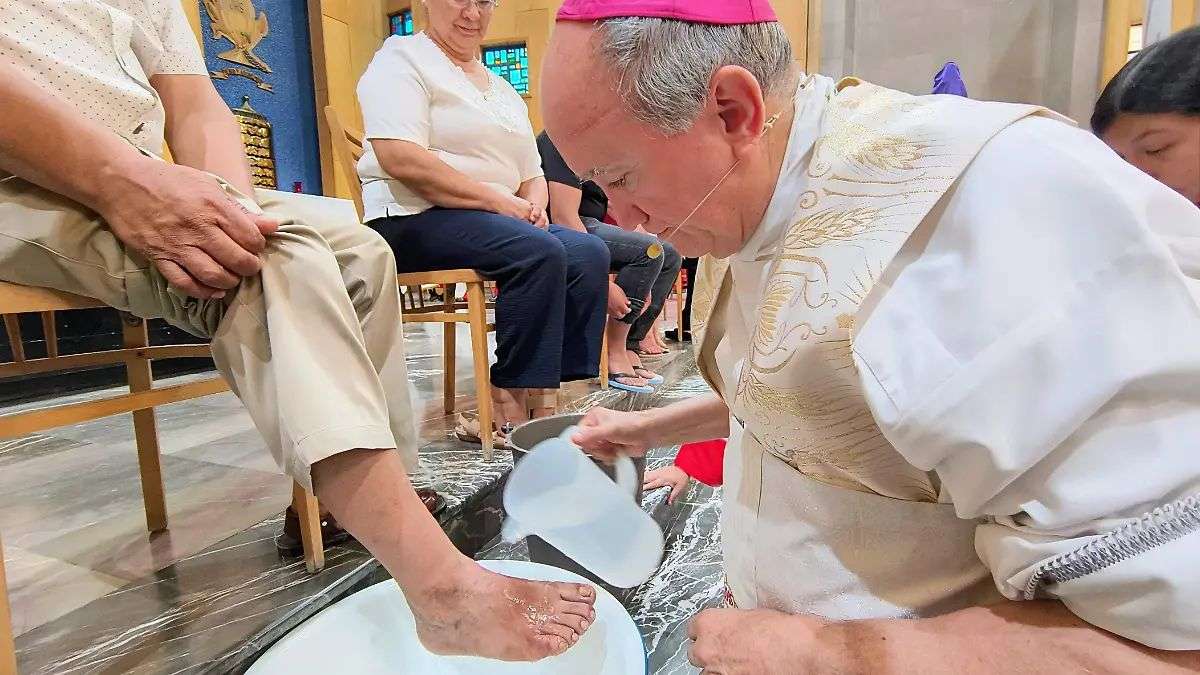 Posteriormente, se realizó el lavatorio de pies, en el que el obispo replicó el gesto de humildad de Jesús al lavar los pies a doce integrantes de la comunidad.