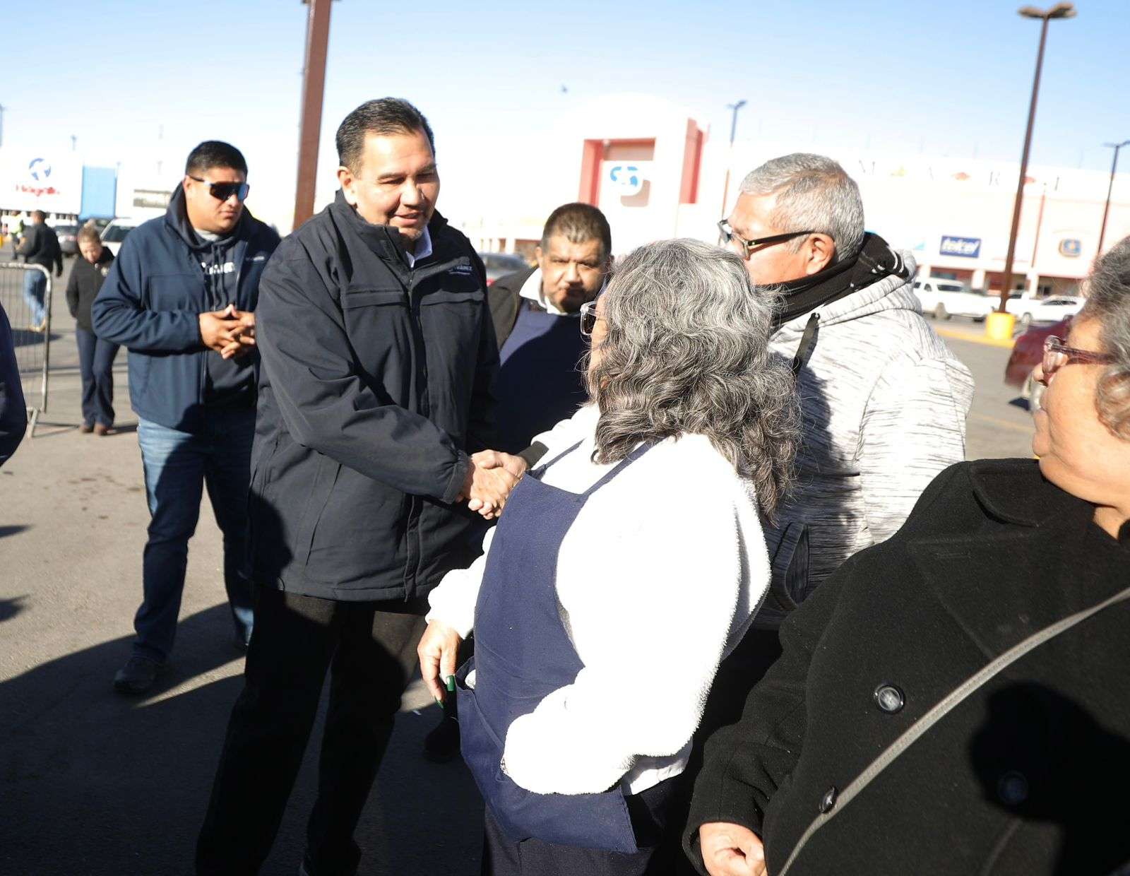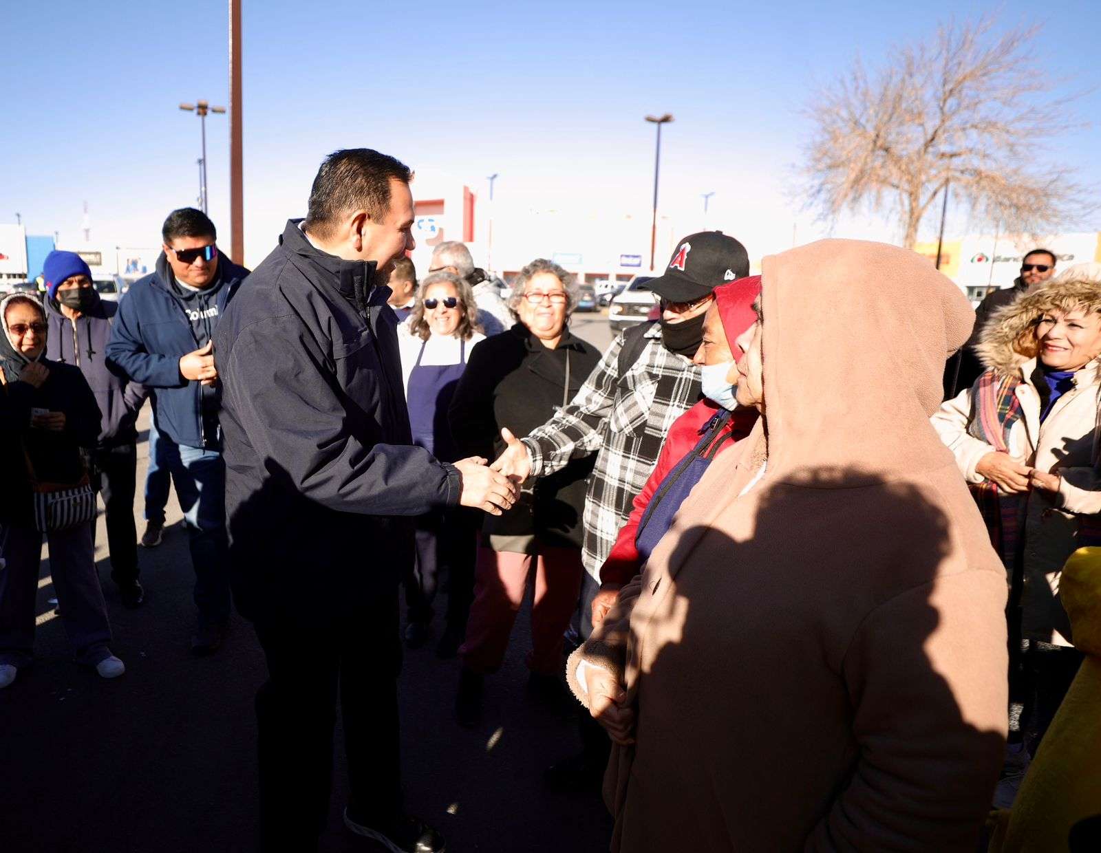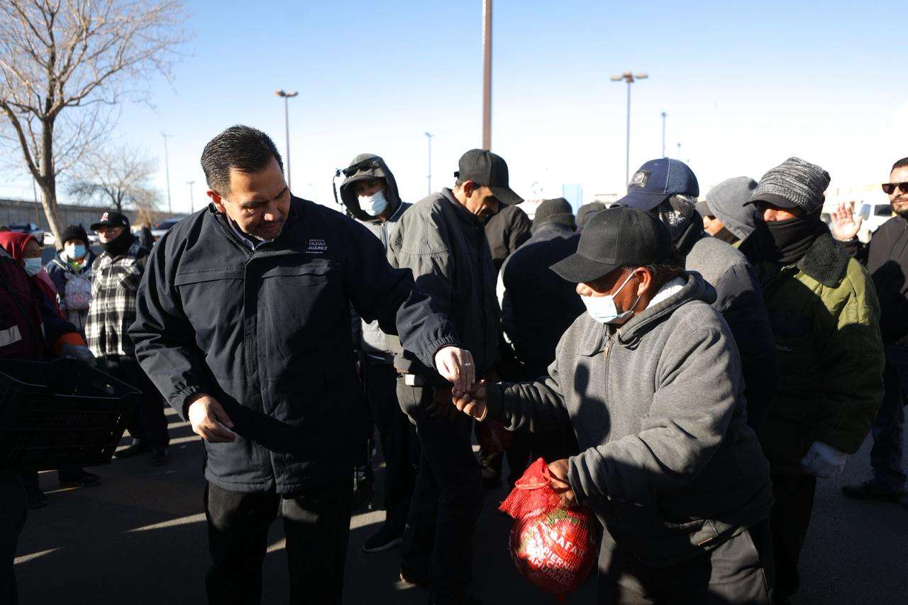 Ciudad Juárez.- El Presidente Municipal, Cruz Pérez Cuéllar, encabezó la entrega de 100 piernas de cerdo a parqueros y empacadores que laboran en un centro comercial ubicado entre la avenida de Las Torres y el Libramiento, como un apoyo directo a su economía familiar.