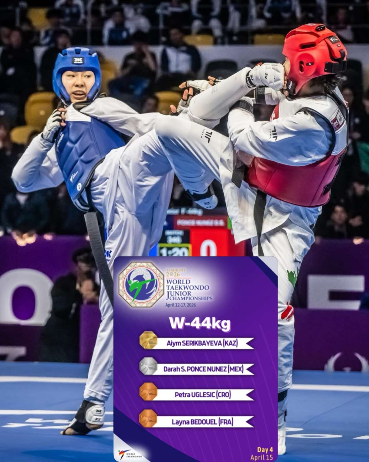 Ciudad Juárez.- La juarense Darah Ponce se convirtió en la subcampeona del mundo, luego del combate contra la kazaja Aiym Serikbayeva en la final del Tashkent 2026 World Taekwondo Junior Championships, torneo que se efectúa en Tashkent, Uzbekistán.