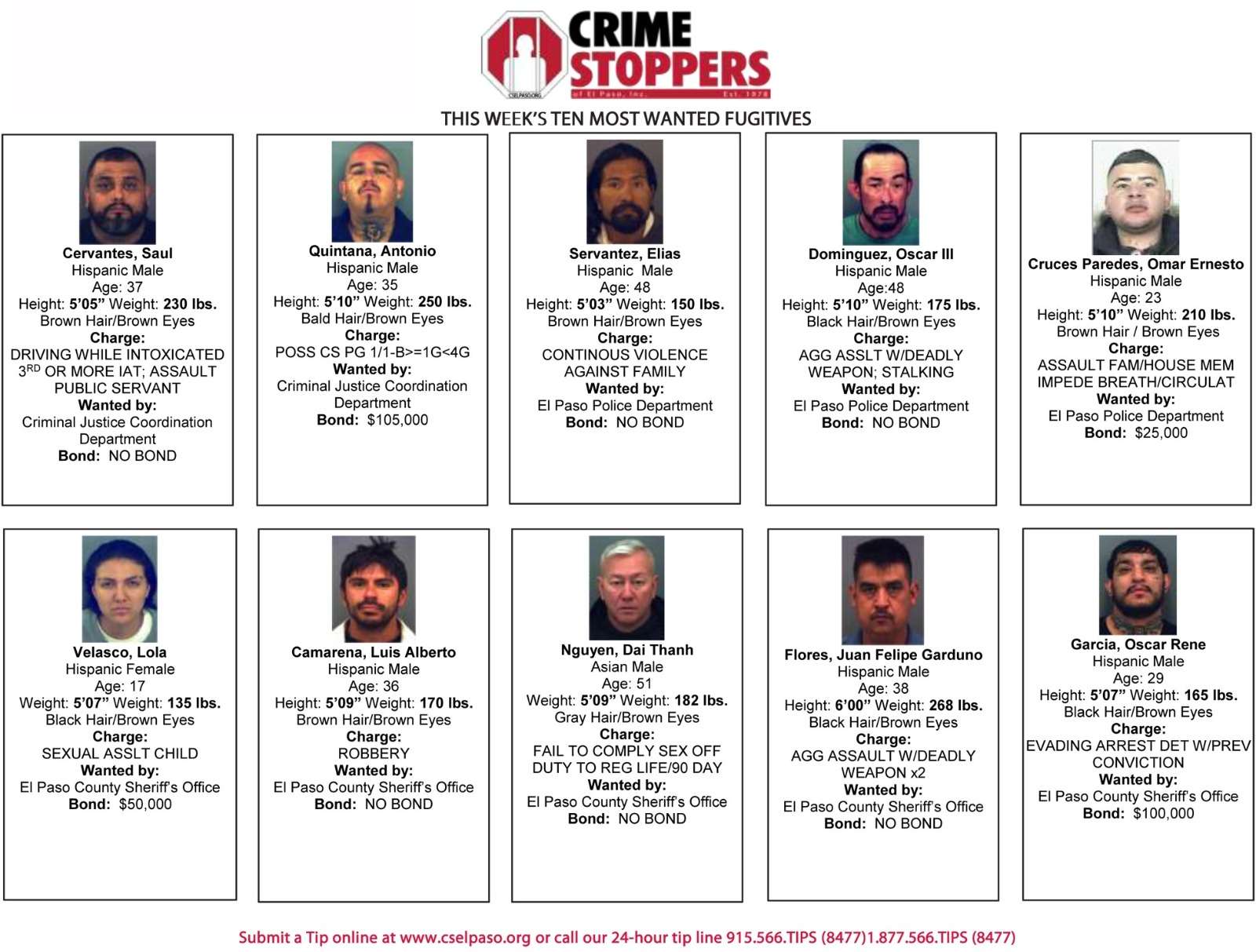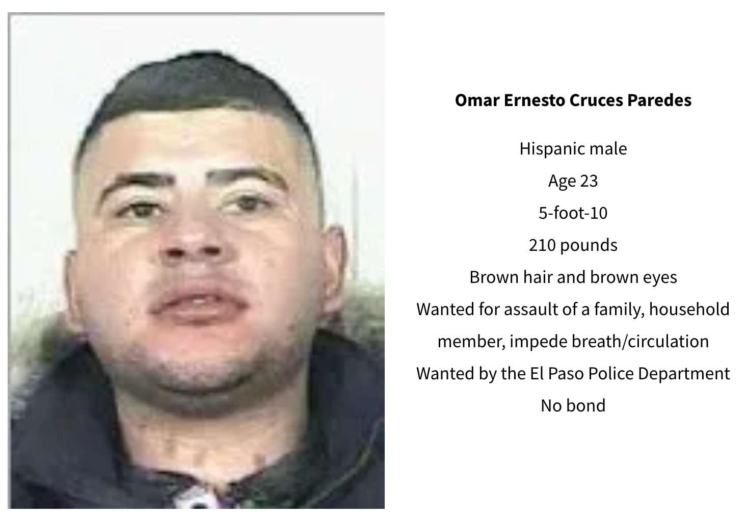 Se trata de Omar Ernesto C. P., quien es señalado por autoridades de El Paso, Texas, como prófugo de la justicia por el delito de agresión a un familiar o miembro del hogar por obstrucción de la respiración o circulación. Por información que condujera a su arresto, el Departamento de Policía de El Paso y la Oficina del Sheriff del Condado ofrecían una recompensa de hasta 25 mil dólares.