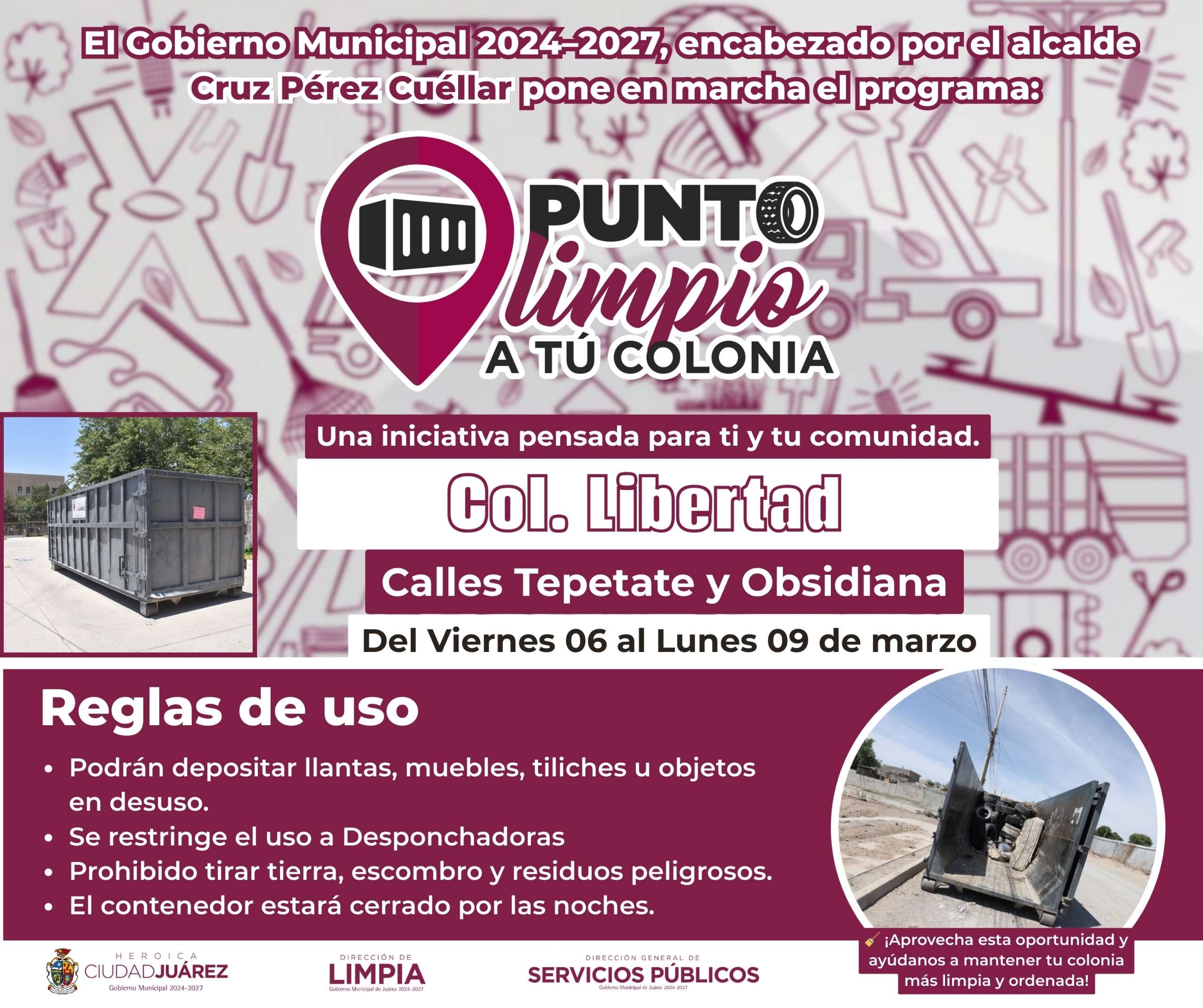 “Invitamos a todos los juarenses de estas colonias y sectores cercanos a que aprovechen la herramienta. Es un contenedor grande de 30 metros cúbicos, donde podrán depositar de manera práctica, gratuita y responsable tiliches, colchones, muebles dañados, tapetes, algunas llantas y otros objetos que ya no utilicen”, señaló.