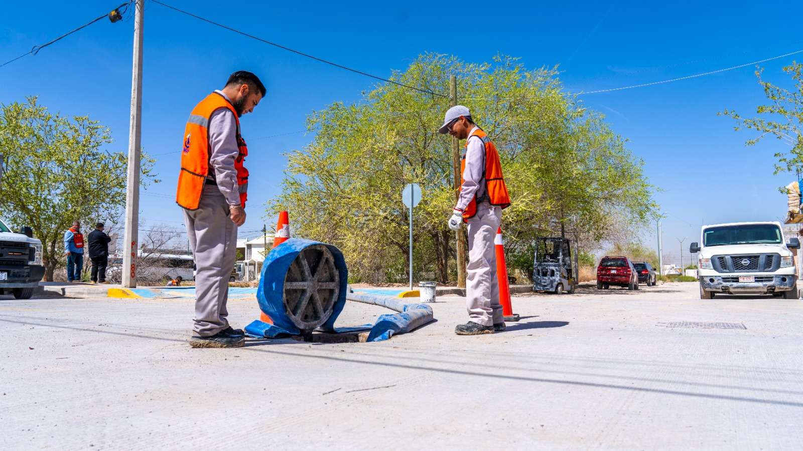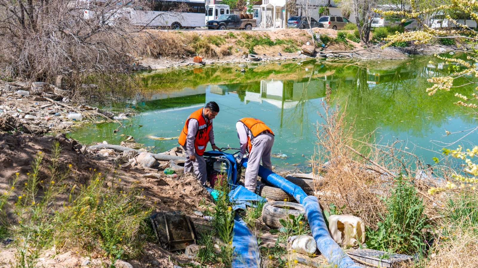 Ciudad Juárez.- Atendiendo las peticiones de los vecinos del Mezquital, la Junta de Agua y Saneamiento de Juárez, realiza acciones de limpieza del dique ubicado en el cruce de las calles Soja y Aira.