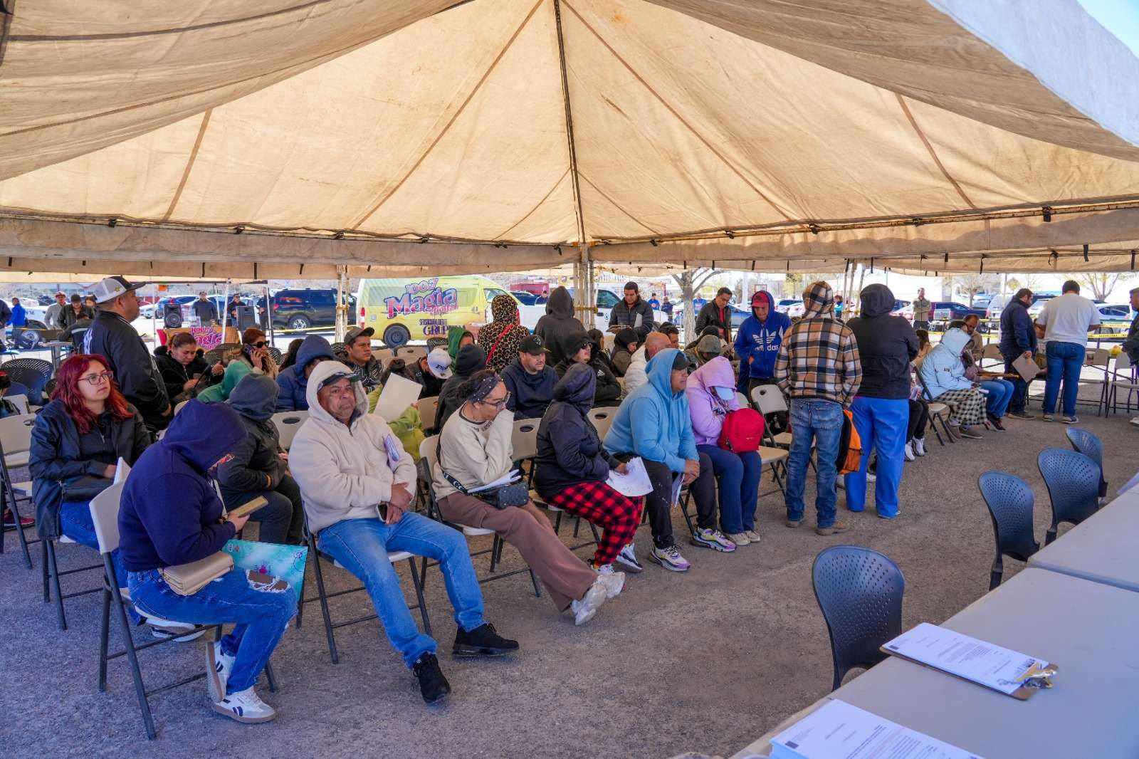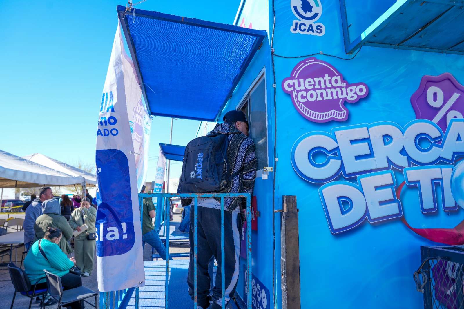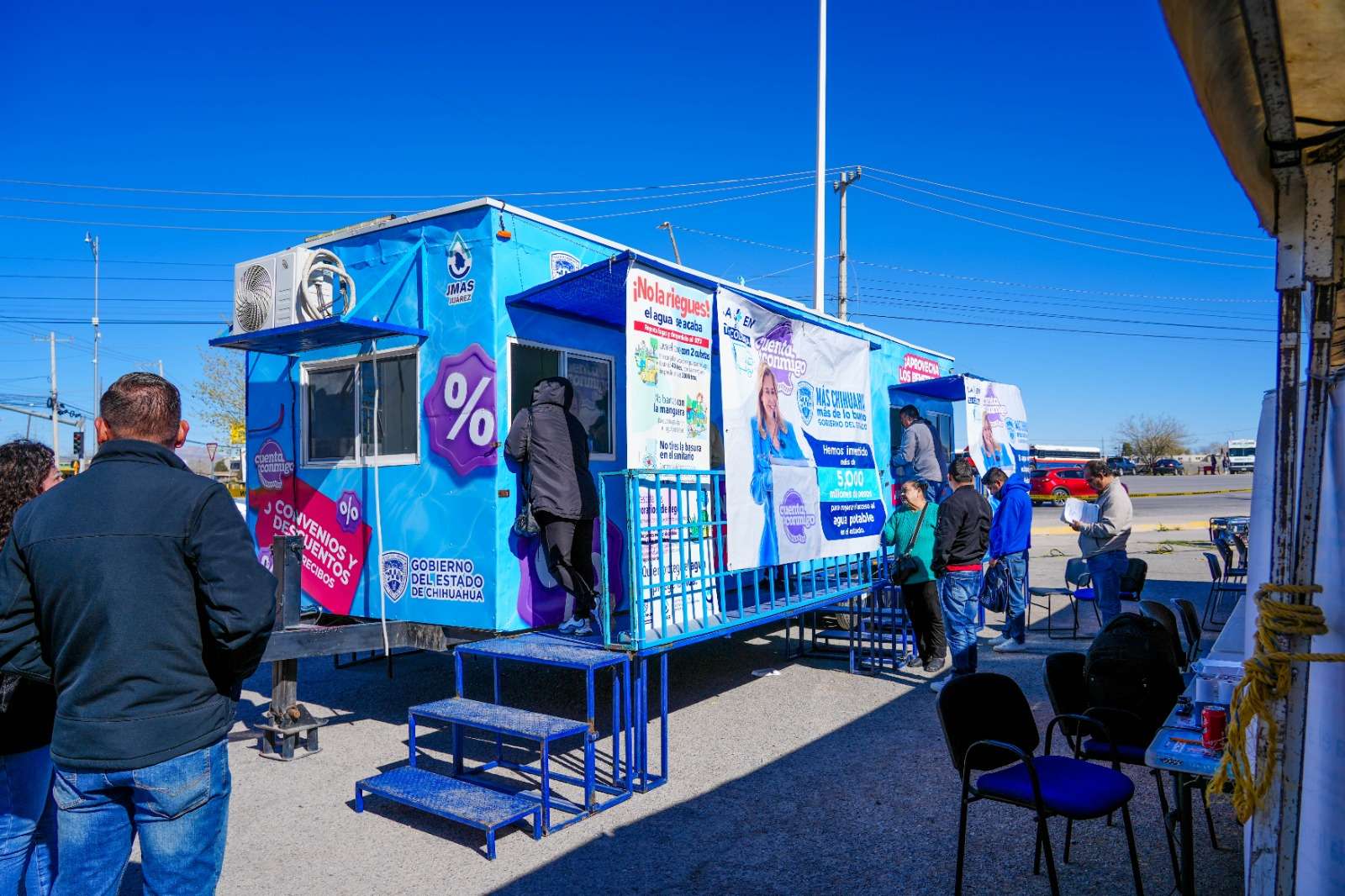 Ciudad Juárez.- La Junta de Agua y Saneamiento de Juárez, acercó este sábado sus servicios al estacionamiento de Soriana Porvenir, facilitando a los usuarios la oportunidad de regularizar sus cuentas, sin necesidad de acudir entre semana a oficinas.