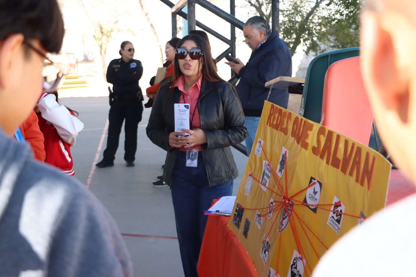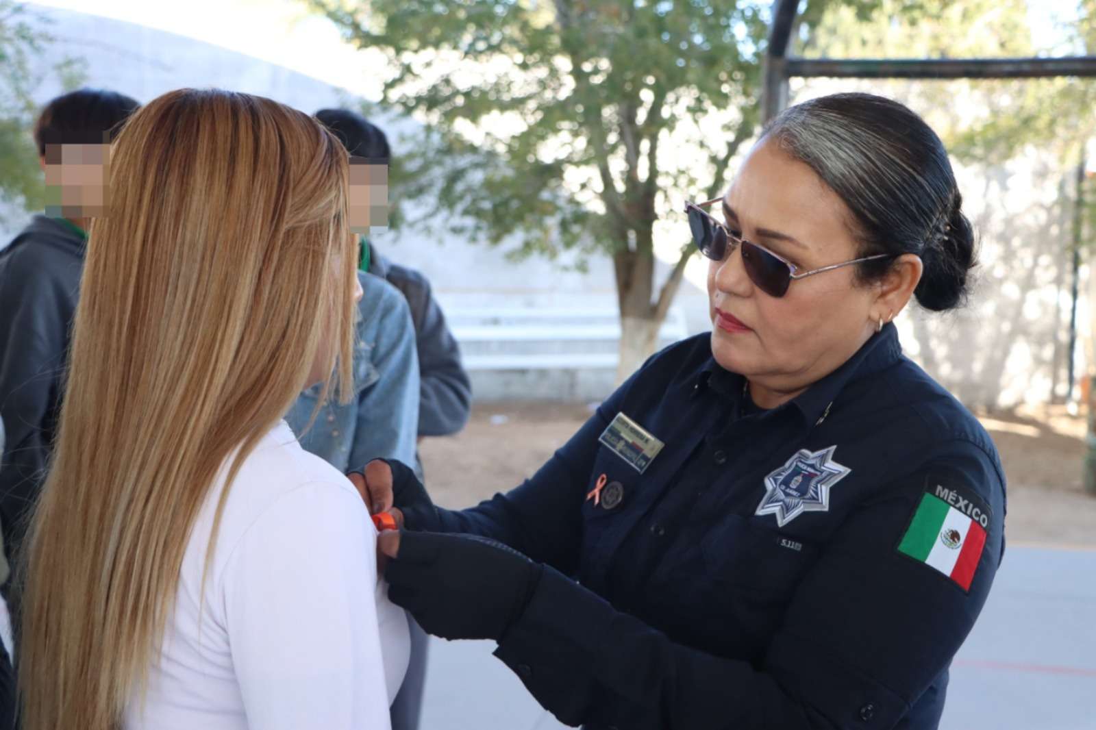 Ciudad Juárez.- En el marco del Día Internacional de la Erradicación de la Violencia Contra la Mujer, la Secretaría de Seguridad Pública Municipal a través de la Dirección Especializada en Violencia Familiar y de Género, llevó módulos informativos al Colegio de Estudios Científicos y Tecnológicos del Estado número siete (CECyT 7).