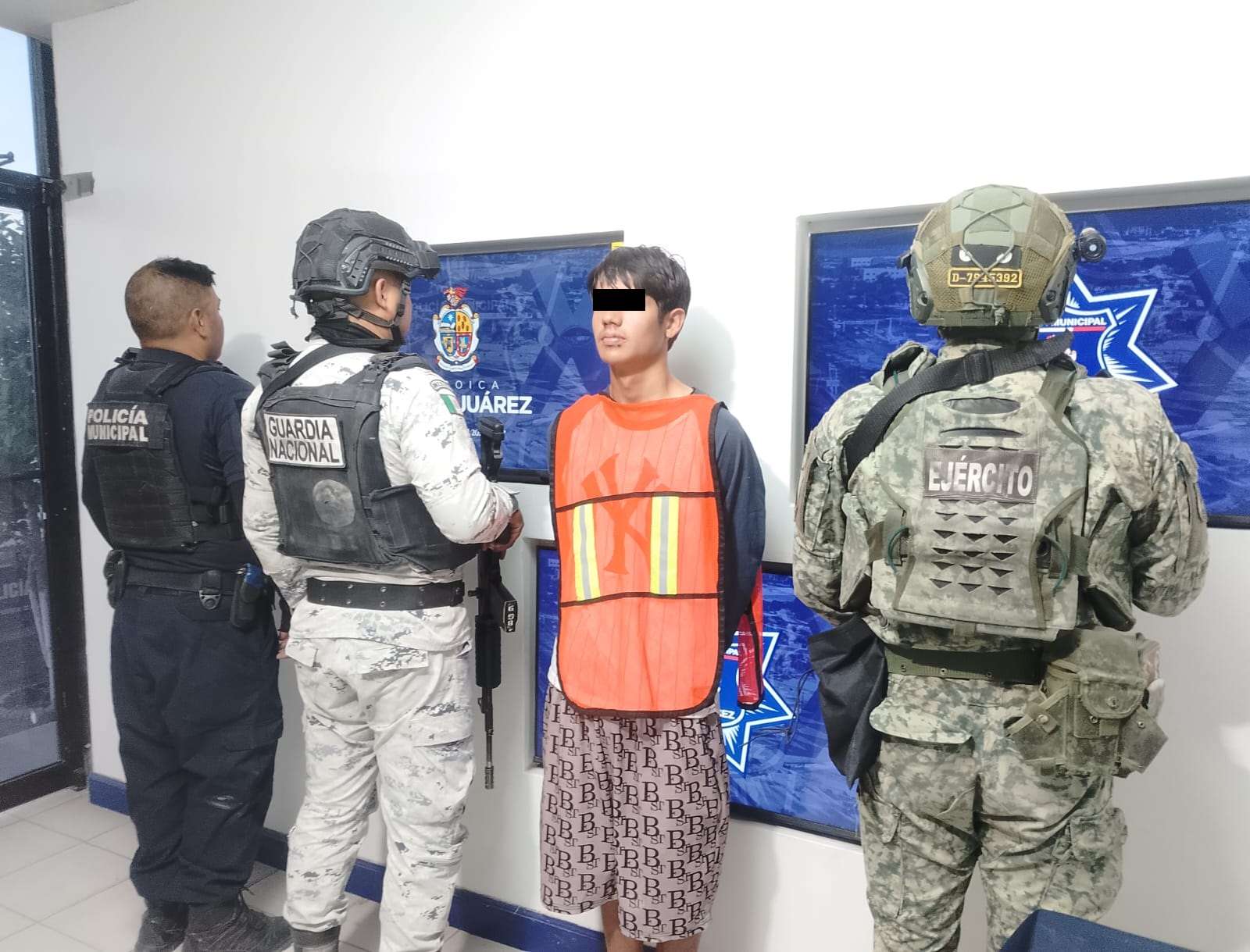 Ciudad Juárez .- Agentes de la Secretaría de Seguridad Pública Municipal en coordinación con Guardia Nacional y la Secretaría de la Defensa Nacional, arrestaron a Ramón Alexis M. J., por su presunta responsabilidad en la comisión de delitos contra la ley federal de armas de fuego y explosivos.