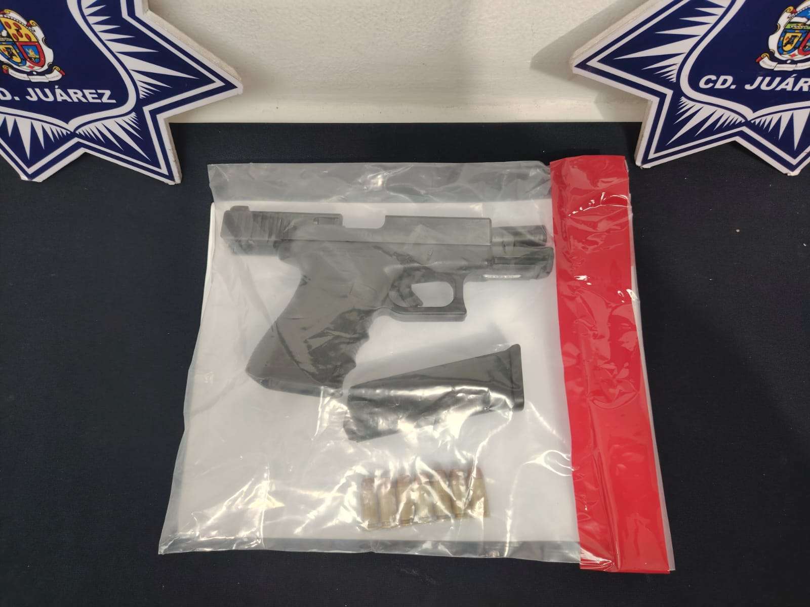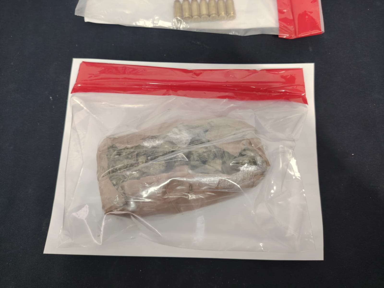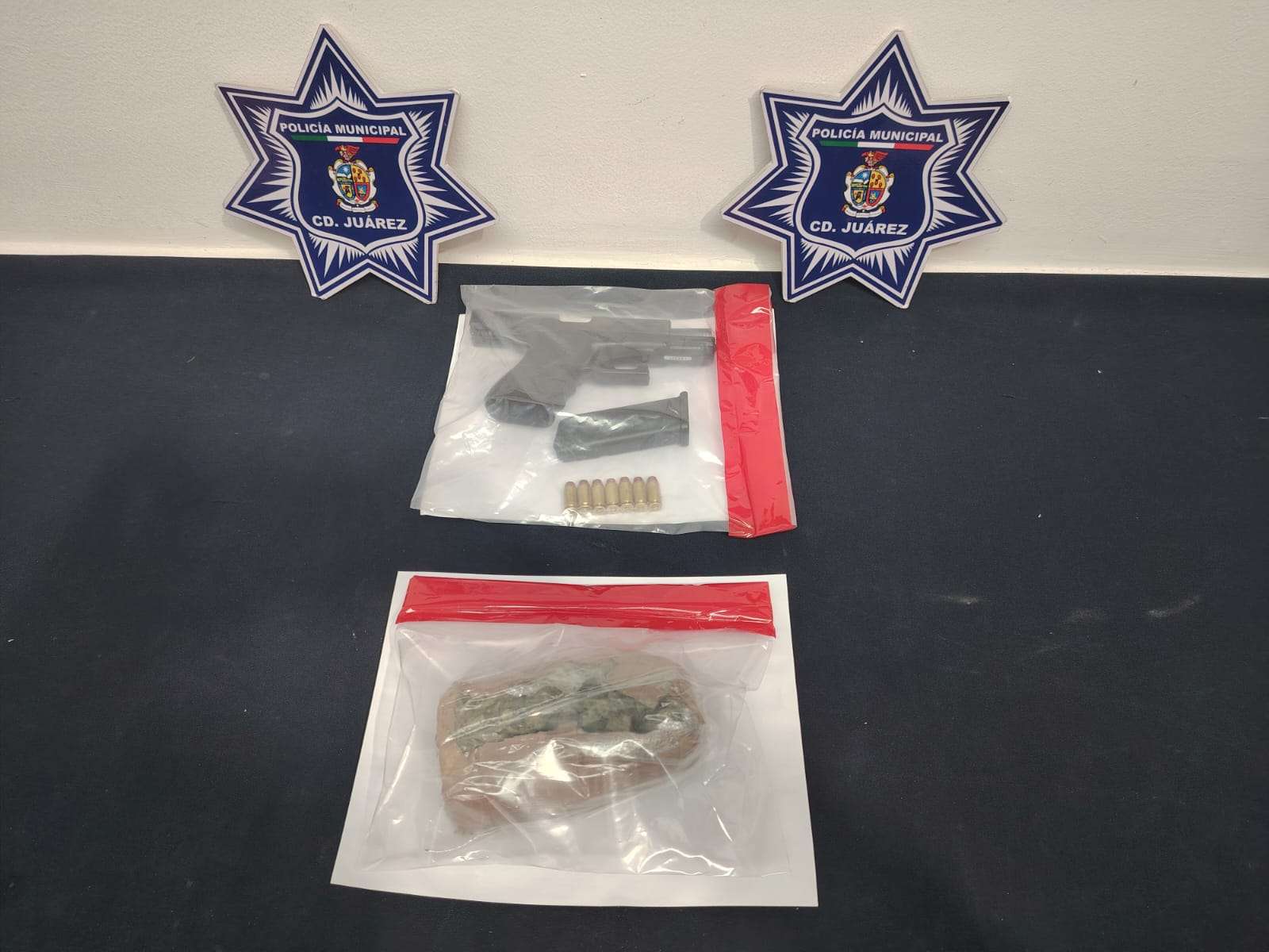 Tras la revisión le fue localizada un arma de fuego calibre .40, con un cargador abastecido con siete cartuchos útiles, así como una bolsa de plástico transparente que contenía un paquete envuelto en cinta color canela con 110 gramos de marihuana, procediendo con su detención.