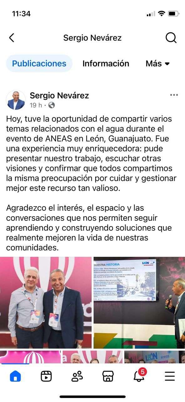 Mientras tanto, Nevárez compartió en sus redes sociales fotografías y un mensaje desde León, Guanajuato, donde participó en un evento organizado por la Asociación Nacional de Empresas de Agua y Saneamiento (ANEAS).
