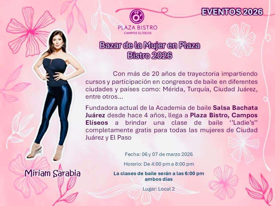 Ciudad Juárez.- En el marco del Bazar de la Mujer 2026, la instructora y fundadora de la Academia Salsa Bachata Juárez, Miriam Sarabia, impartirá una clase gratuita de baile dirigida a mujeres de Ciudad Juárez y El Paso, con el objetivo de promover el bienestar físico, emocional y la convivencia comunitaria.