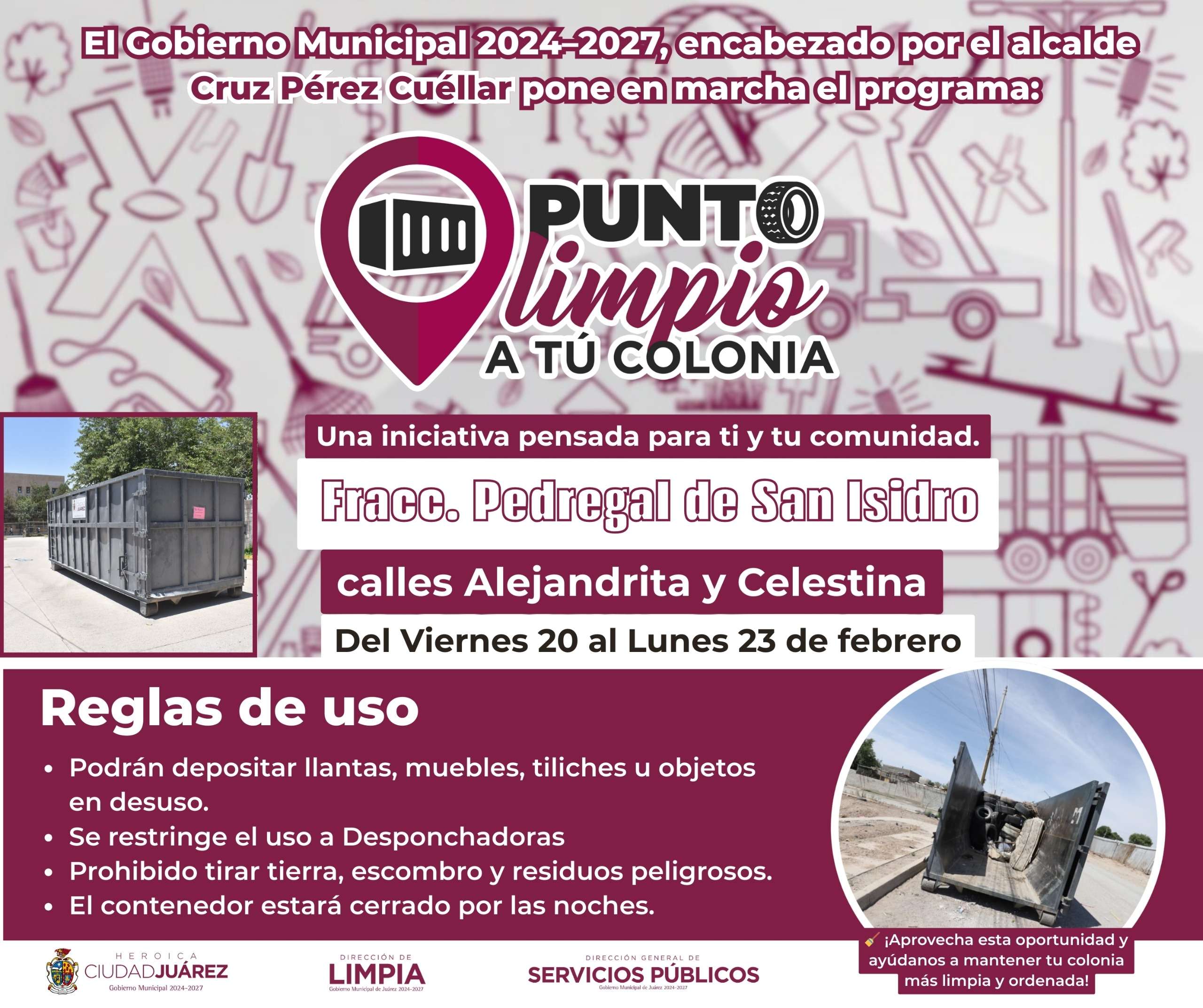 Ciudad Juárez.- La Dirección de Limpia instaló desde ayer y hasta el lunes 23 de febrero, “Puntos Limpios a tu Colonia”, con el objetivo de acercar a los vecinos espacios adecuados para la disposición de tiliches y residuos de gran volumen.