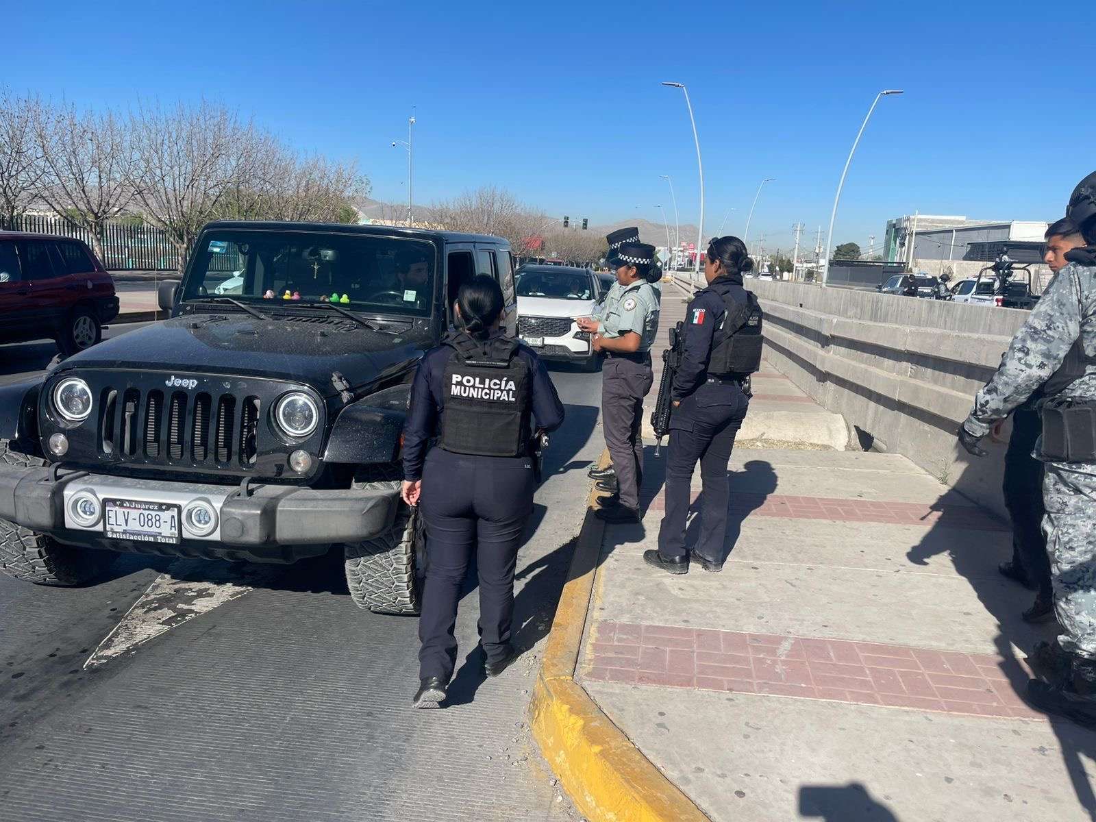 Ciudad Juárez.- La Secretaría de Seguridad Pública Municipal, a través de la Dirección Especializada en Violencia Familiar y de Género (DEVIFG), en coordinación con elementos de la Guardia Nacional, llevó a cabo un operativo de proximidad social en distintos puntos de la ciudad, con el objetivo de acercar a la ciudadanía información sobre los mecanismos para presentar denuncias y fortalecer la confianza en las instituciones de seguridad.