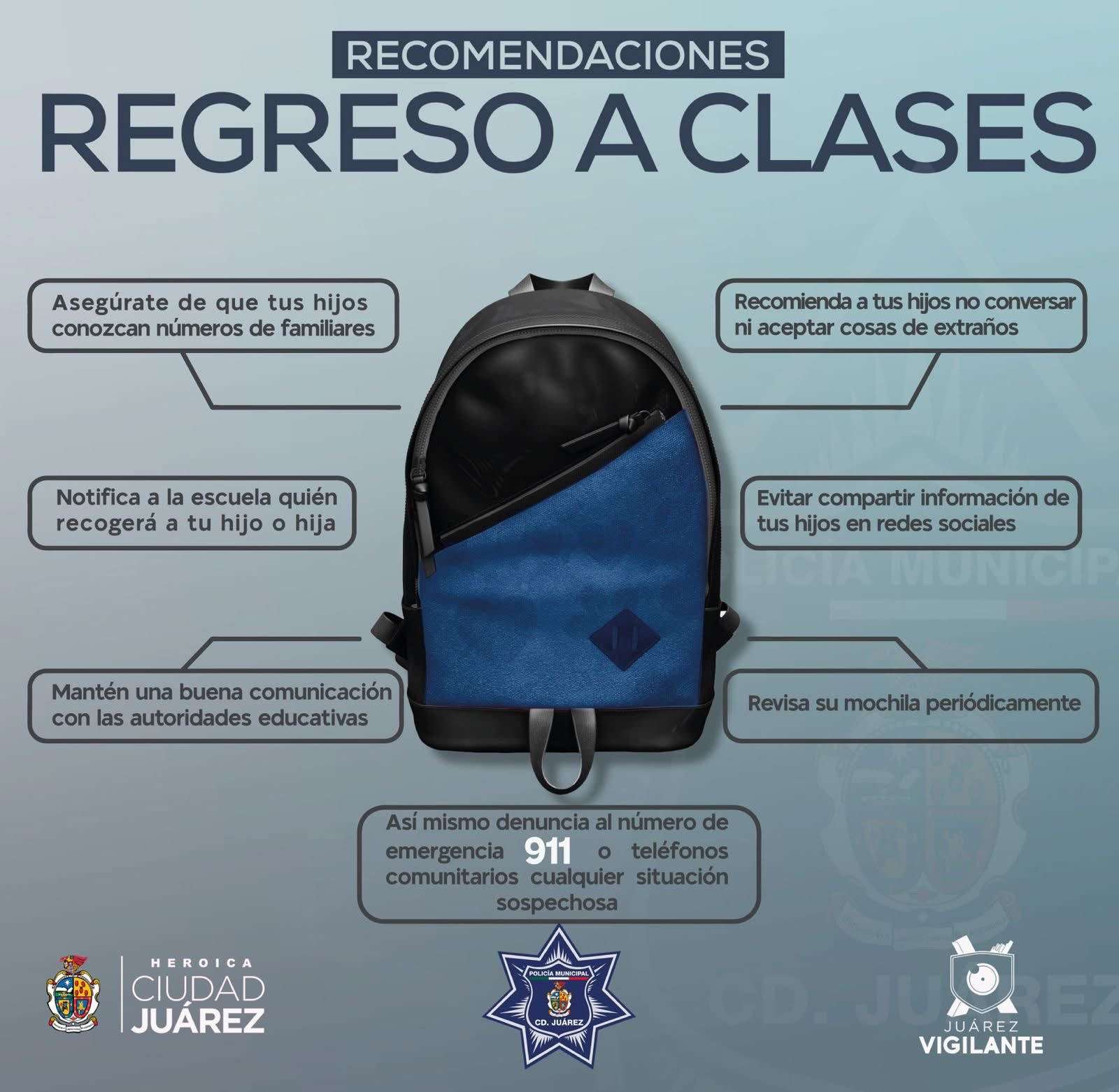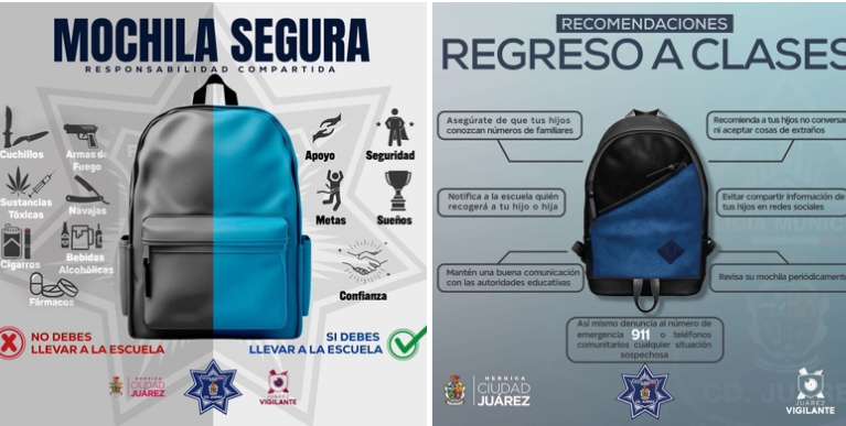 Ciudad Juárez.– Con el retorno a las aulas de una amplia población estudiantil en Ciudad Juárez, la Secretaría de Seguridad Pública Municipal (SSPM) emitió recomendaciones y reforzó la difusión del programa Mochila Segura, como parte de las acciones preventivas para garantizar entornos escolares libres de riesgos.