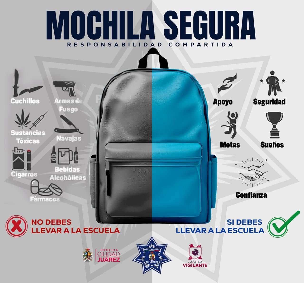 El programa Mochila Segura, implementado en coordinación con autoridades educativas y padres de familia, busca evitar el ingreso a los planteles de objetos que representen un riesgo para la comunidad escolar, como cuchillos, armas de fuego, sustancias tóxicas, fármacos sin prescripción, cigarros o bebidas alcohólicas. A la par, promueve valores como la confianza, el apoyo, la seguridad y el cumplimiento de metas académicas.