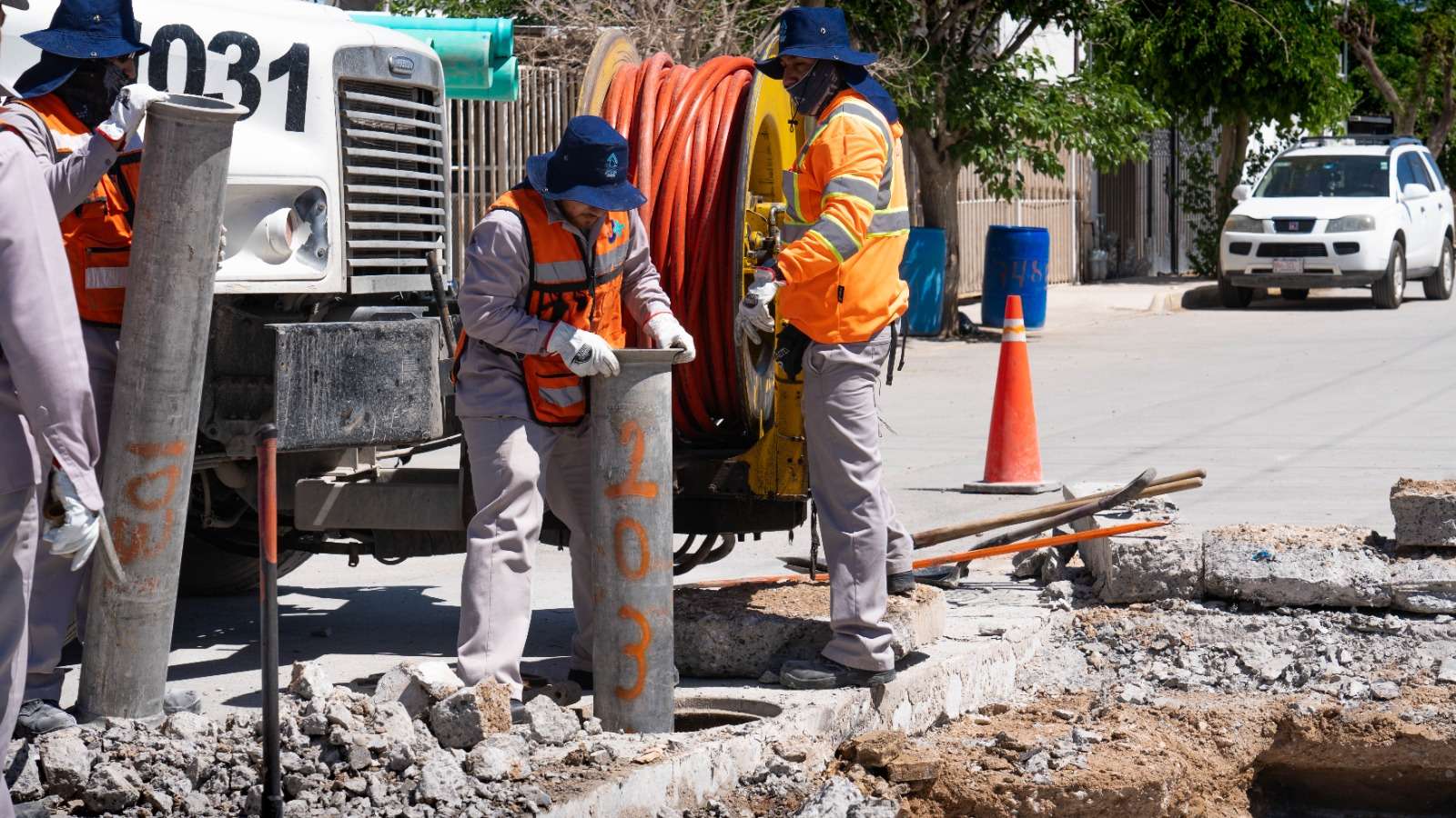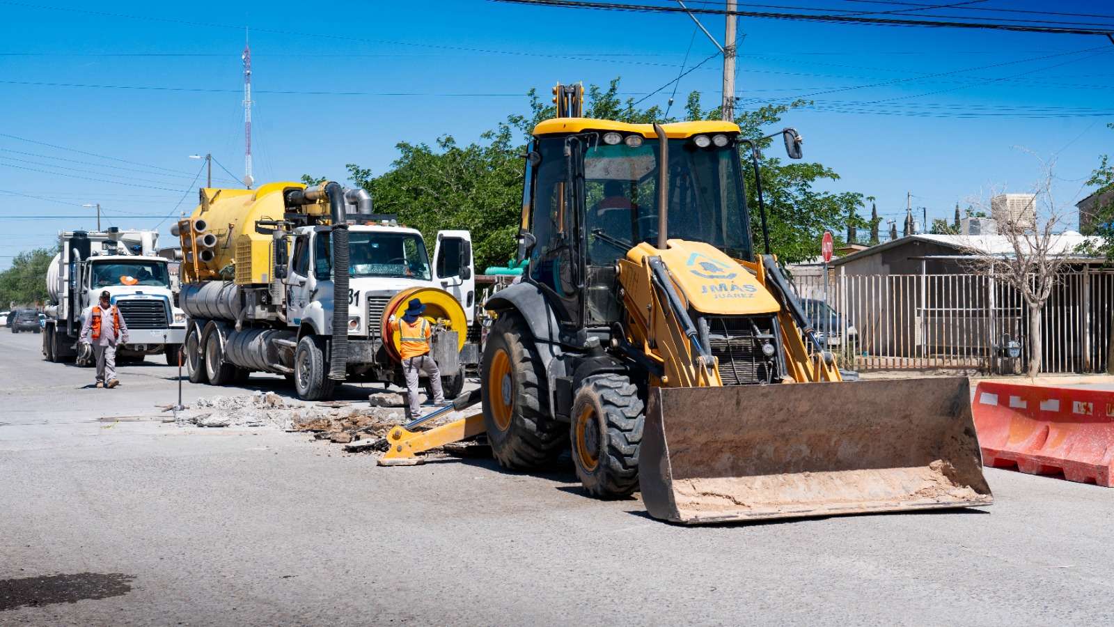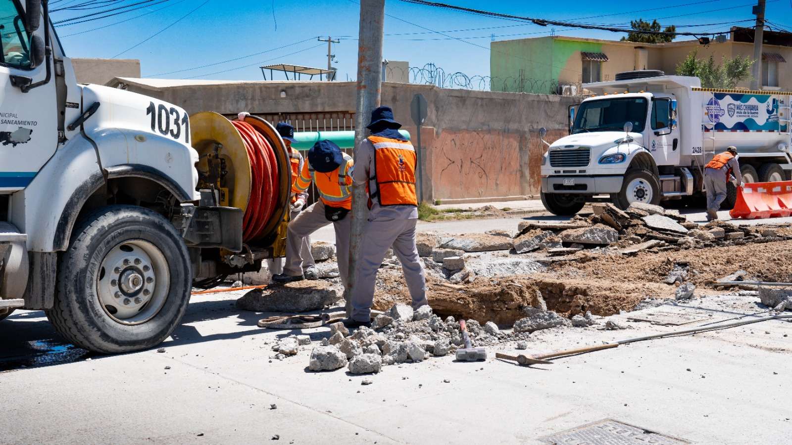 Ciudad Juárez.- La Junta de Agua y Saneamiento de Juárez, a través del departamento de alcantarillado, trabaja en la reparación de un hundimiento registrado en el cruce de las calles Aviación y Hangar, en el fraccionamiento Jardines del Aeropuerto.