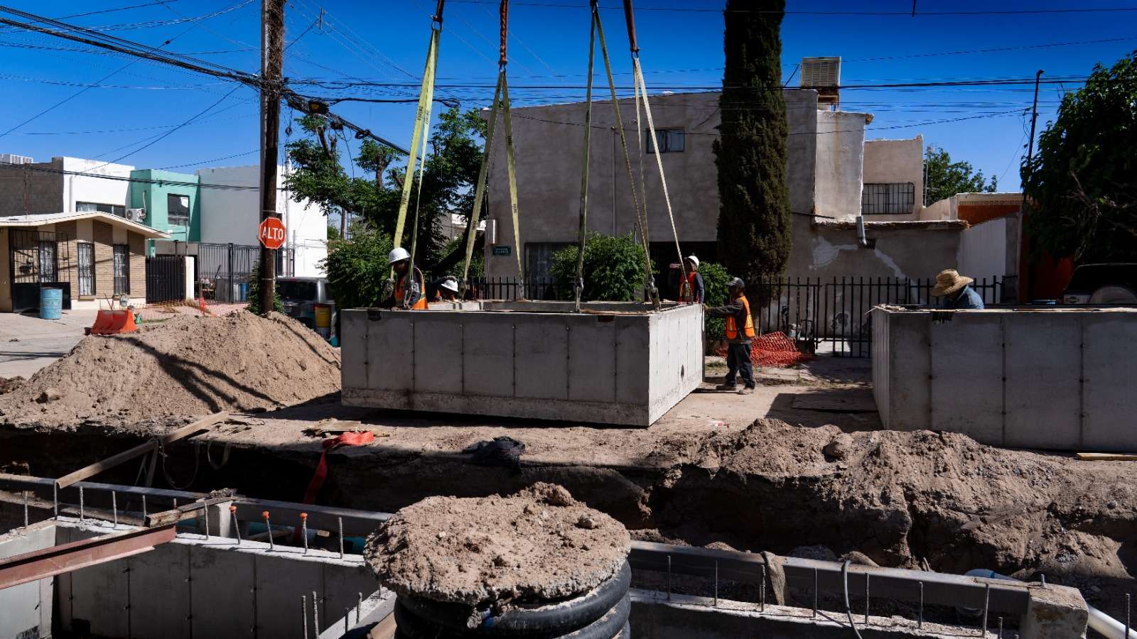 Ciudad Juárez.- La Junta de Agua y Saneamiento de Juárez realiza la construcción de la infraestructura pluvial en entre las calles Apolo y Atlante, resolviendo así las inundaciones que se han presentado durante más de 50 años en la zona.