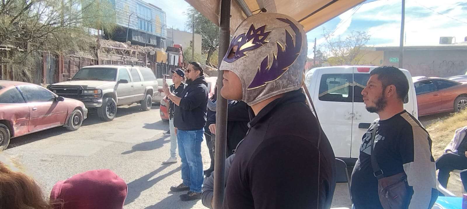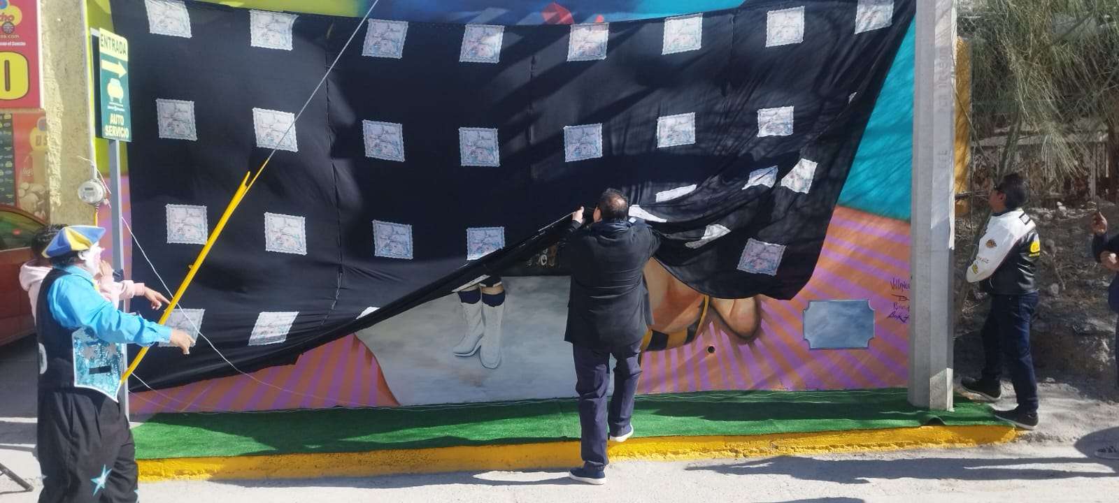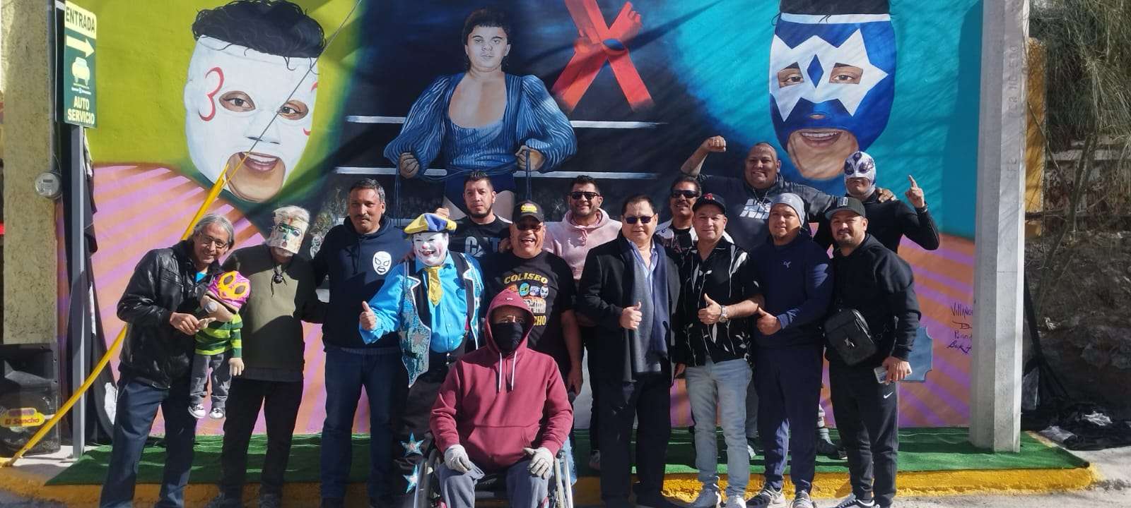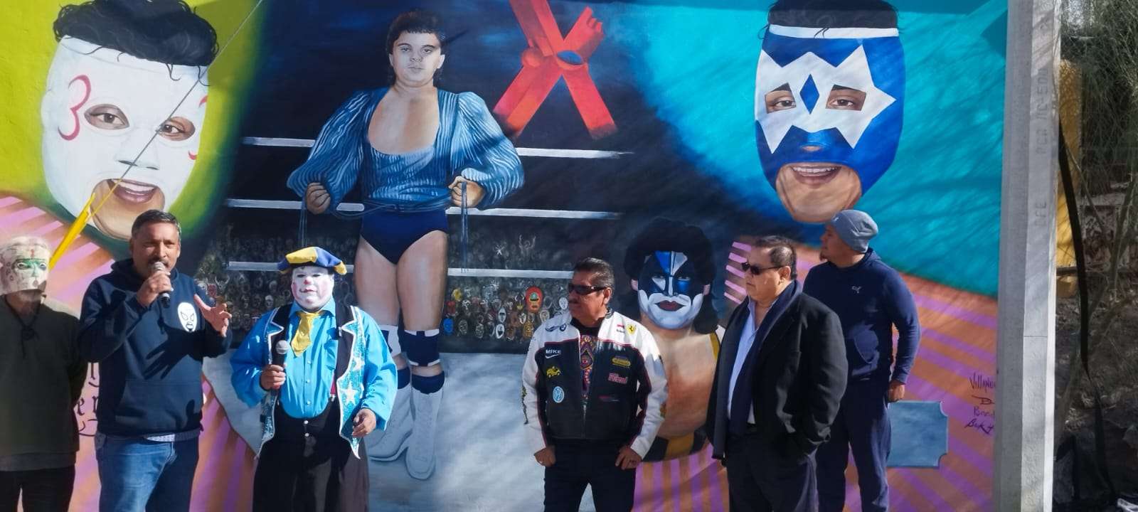 En una sencilla pero calurosa ceremonia luchadores, locutores y familias completas acudieron a la develación del enorme mural ubicado en la calle 16 de Septiembre 4370, de la colona Durango a un costado de la Barbacoa El Sancho, patrocinador del homenaje.