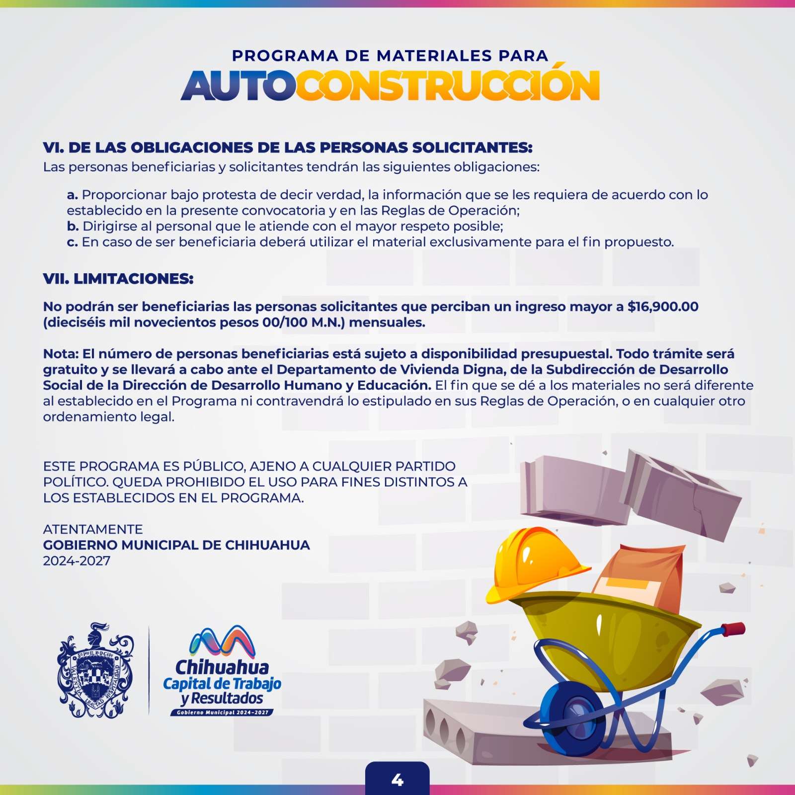 Chihuahua.- El Gobierno Municipal de Chihuahua, a través de la Dirección de Desarrollo Humano y Educación, invita a la ciudadanía a participar en la convocatoria del Programa Materiales para Autoconstrucción 2026, dirigido a personas mayores de edad y familias en situación de vulnerabilidad.