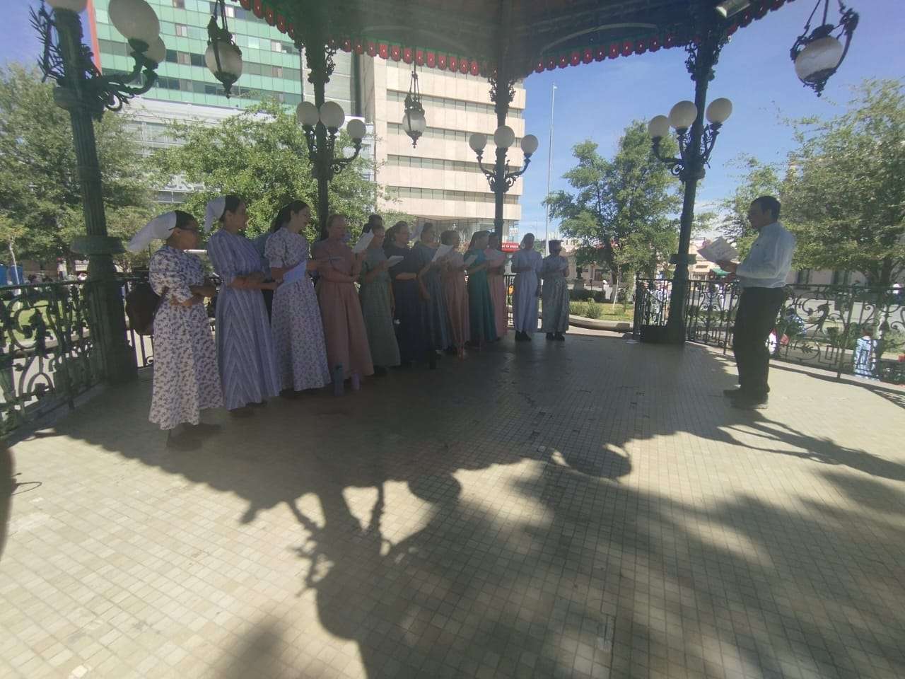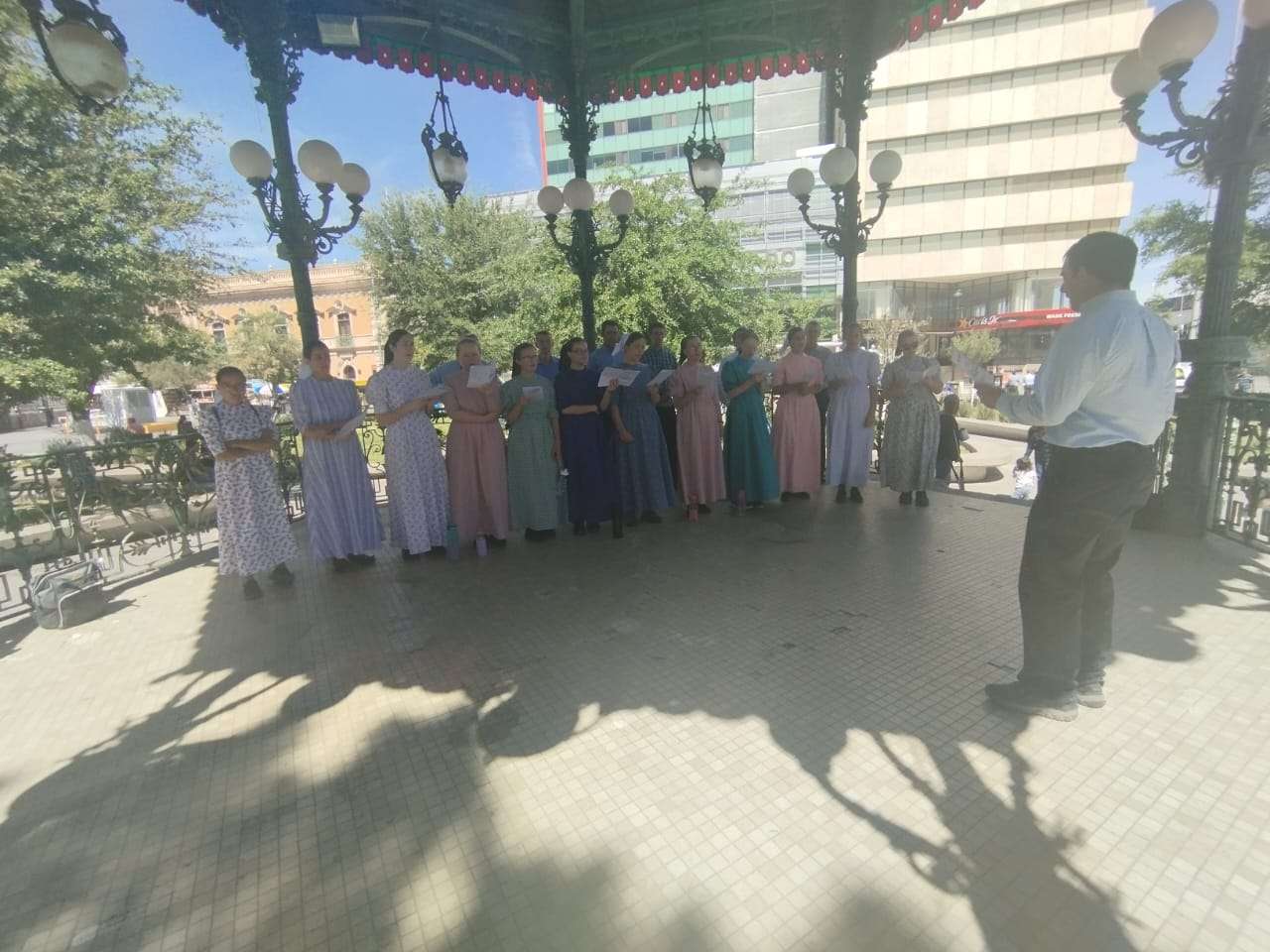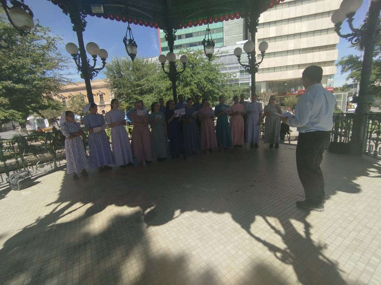El grupo proviene de tres congregaciones ubicadas en la zona oeste del estado: la Iglesia Cristiana Menonita La Esperanza, en San Francisco de Borja; la Iglesia Cristiana de Cuauhtémoc; y la Iglesia Cristiana de Pedernales, en la colonia Rubio. Myers destacó que han sido bien recibidos por la ciudadanía, quienes se acercan con interés, atraídos tanto por su vestimenta como por los cantos, y señaló que permanecerán en el lugar hasta las 15:00 horas.