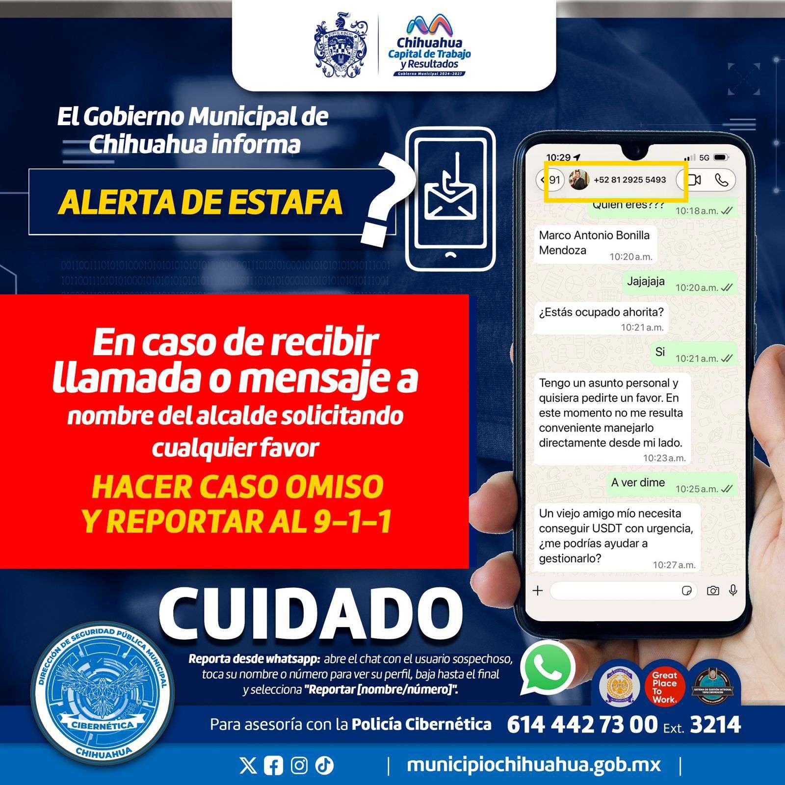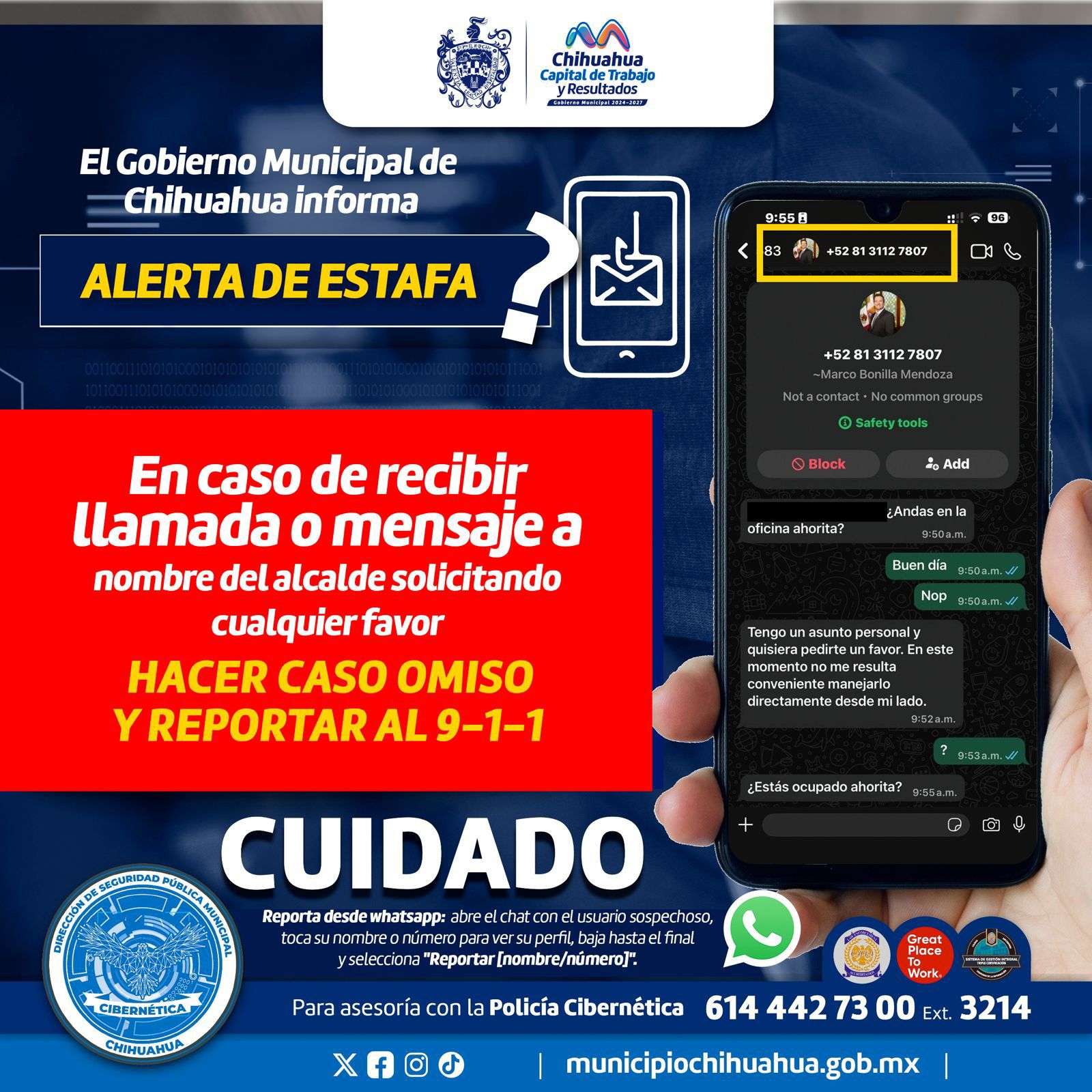 Chihuahua.- El Gobierno Municipal alerta a la ciudadanía sobre la circulación de dos números telefónicos falsos que, a través de WhatsApp, se hacen pasar por el alcalde Marco Bonilla para solicitar favores, lo cual es completamente falso.