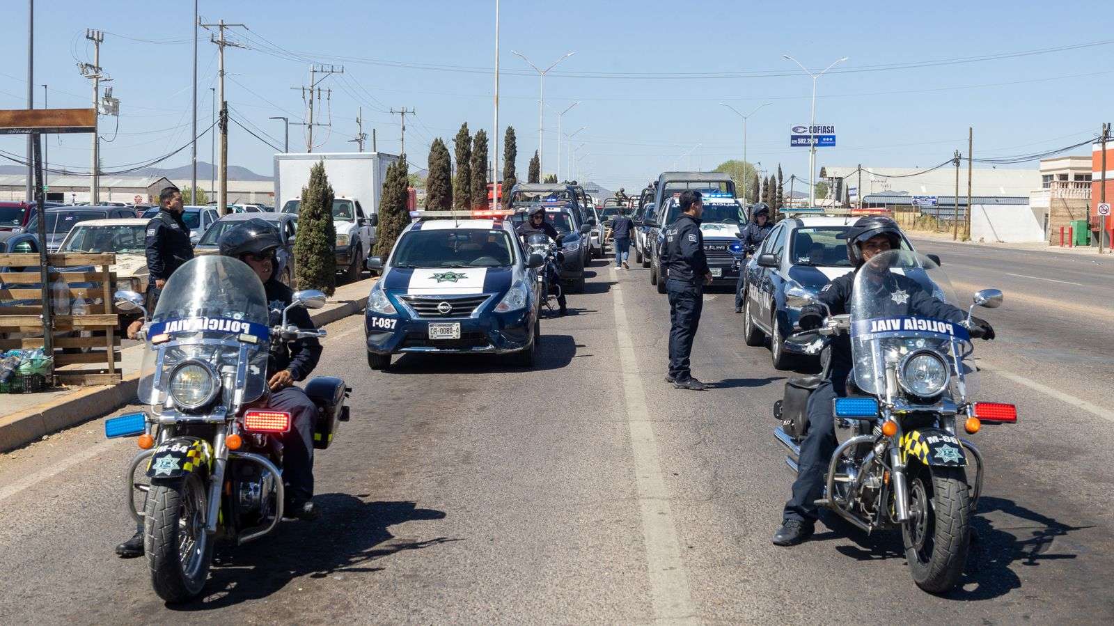 Unidades fijas de Seguridad Pública y Vialidad Municipal en el entronque de la Carretera 5 y Carretera 16. Además, entre 13 y 15 unidades adicionales realizarán recorridos constantes en las salidas principales.