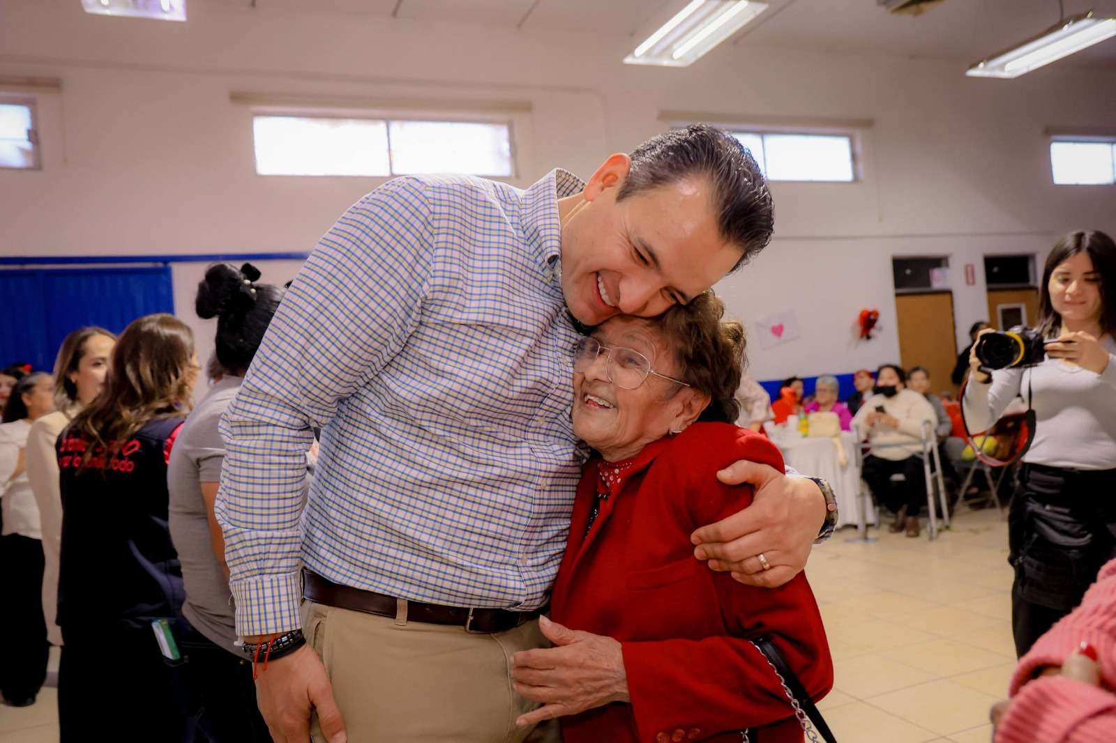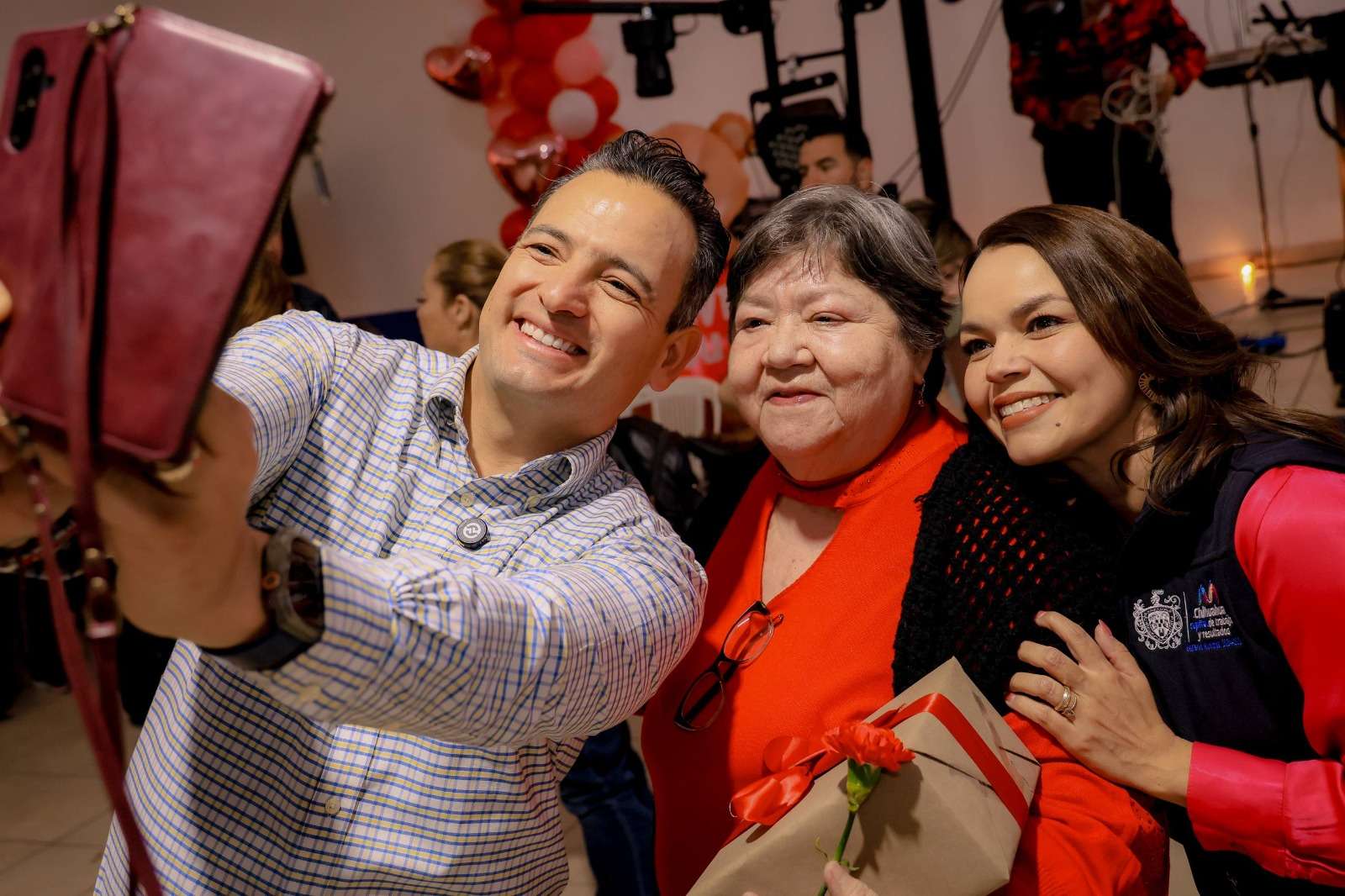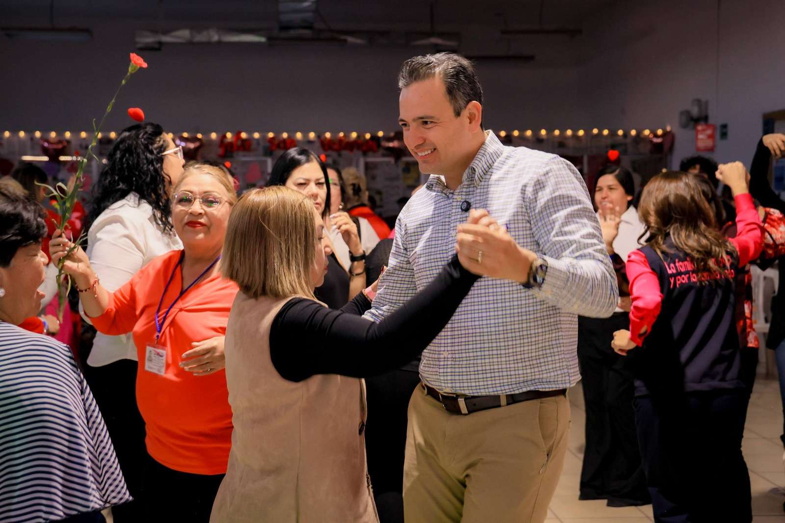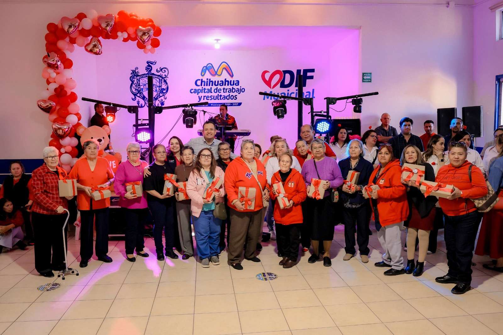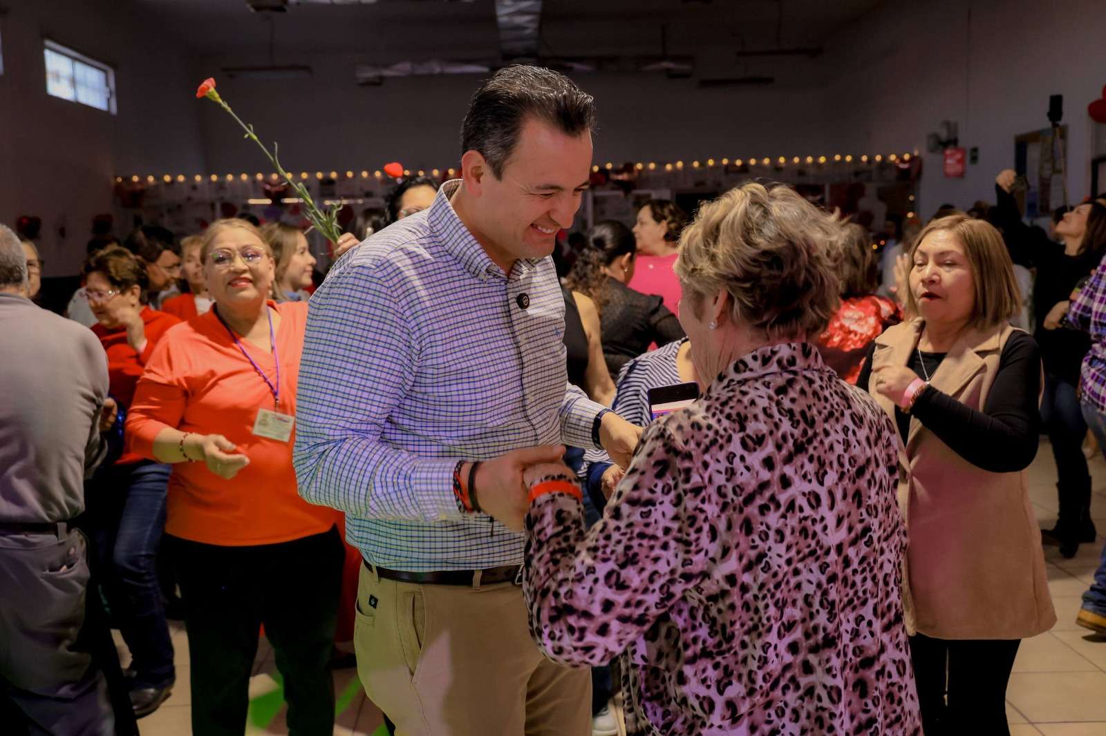 Chihuahua.- El alcalde de Chihuahua, Marco Bonilla, acompañado de su esposa Karina Olivas, presidenta del DIF Municipal, asistió al “Baile de Corazones” organizado en el Centro Comunitario de Ranchería Juárez, donde convivió con integrantes de los clubes del abuelo de la zona sur de la ciudad, quienes disfrutaron de una tarde llena de música, baile y celebración con motivo del Día de San Valentín.
