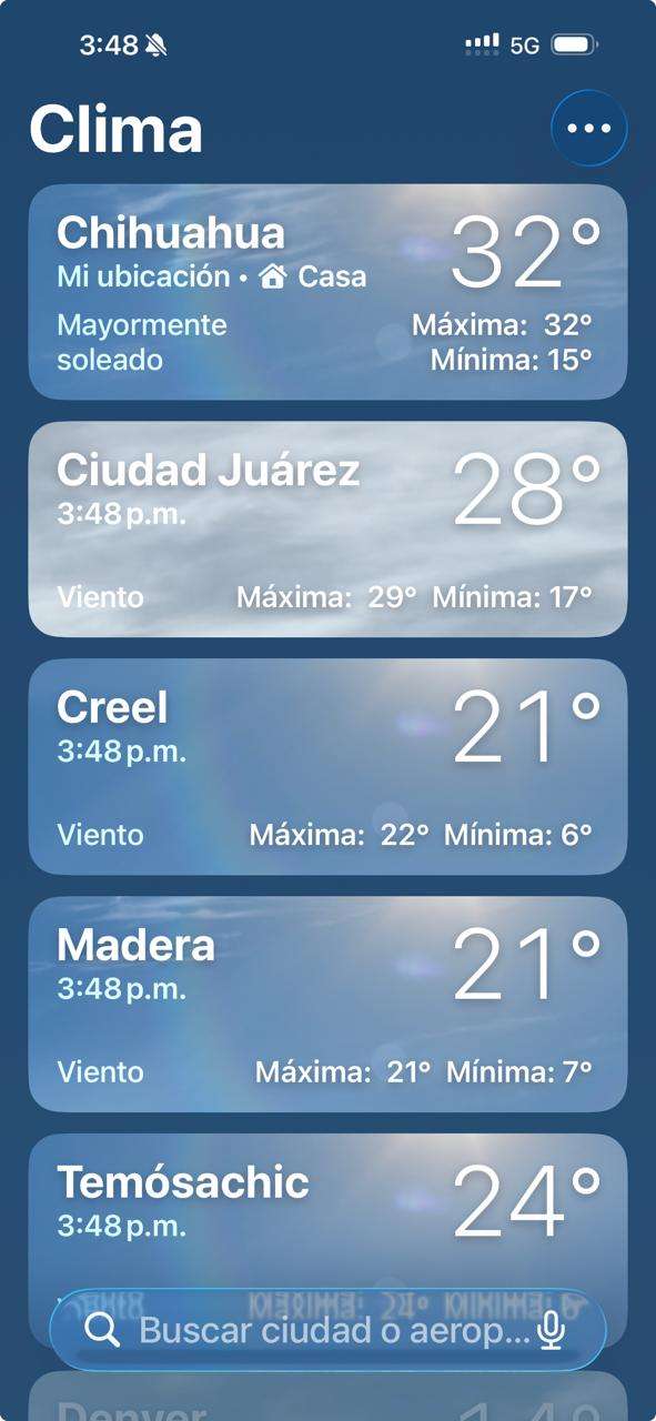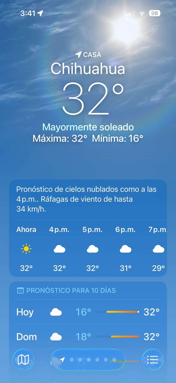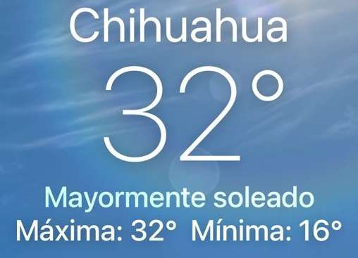 Chihuahua. - Este sábado, la capital del estado registró una tarde calurosa con temperaturas que alcanzaron los 32 grados centígrados bajo un cielo mayormente soleado. Las condiciones climáticas incluyen vientos de 21 kilómetros por hora, con ráfagas que podrían alcanzar los 34 kilómetros por hora durante el resto de la jornada.
