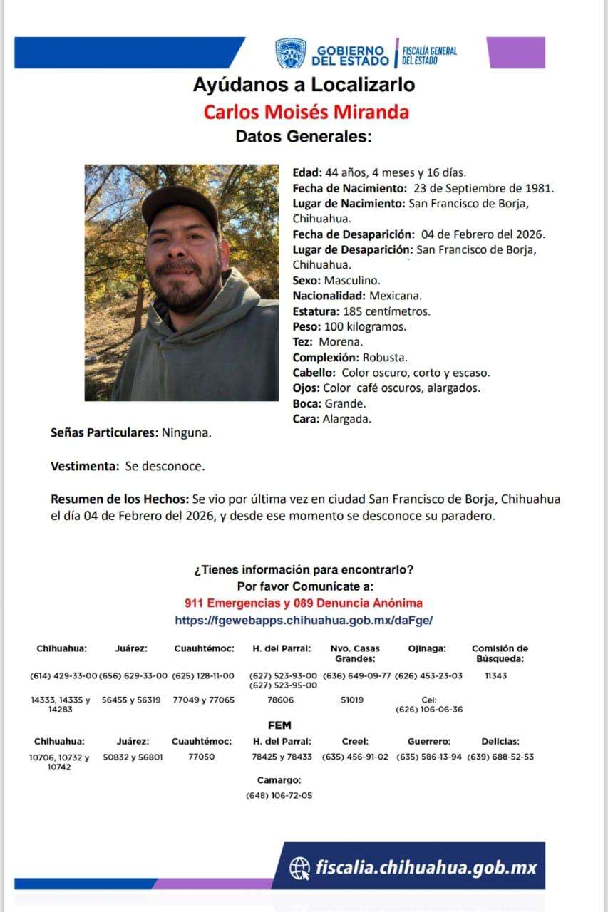 San Francisco de Borja, Chih.– Autoridades solicitaron el apoyo de la población para localizar a dos hombres reportados como desaparecidos en San Francisco de Borja desde el pasado 4 de febrero.