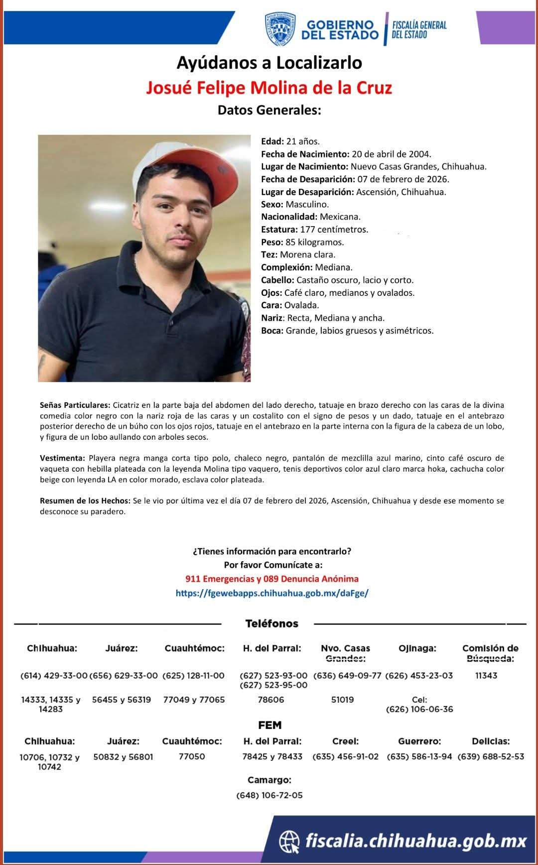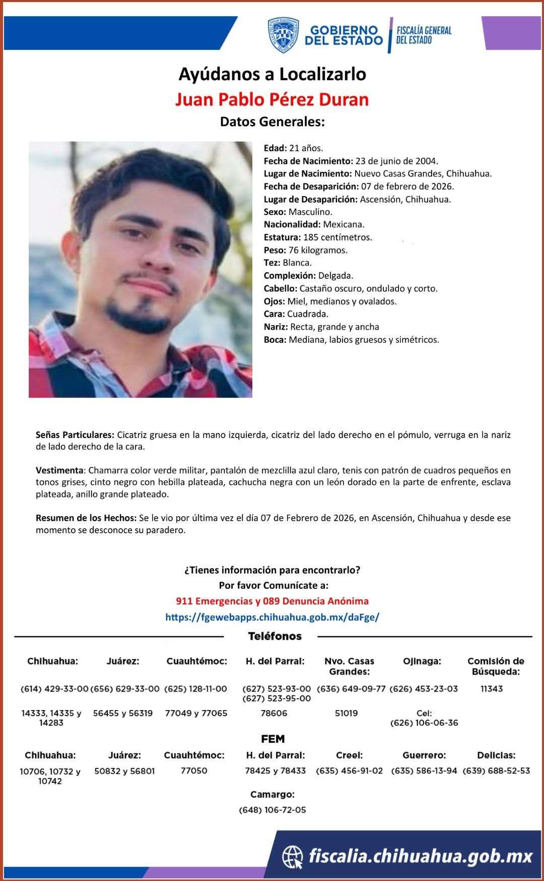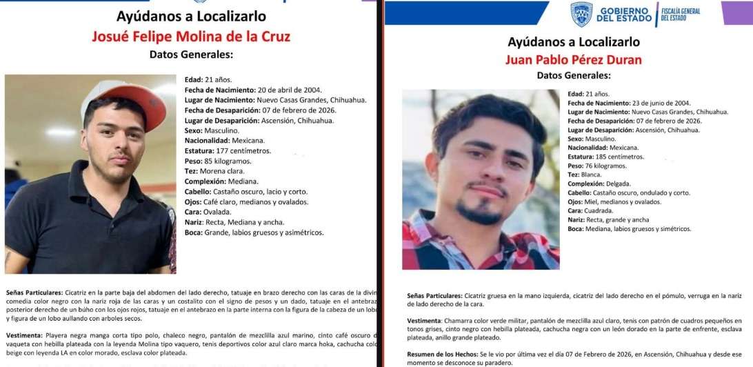 Ascensión, Chihuahua. - La Fiscalía General del Estado solicita la colaboración urgente de la ciudadanía para localizar a Juan Pablo Pérez Durán y Josué Felipe Molina de la Cruz, ambos de 21 años, quienes desaparecieron de manera conjunta el pasado 07 de febrero de 2026 en el municipio de Ascensión, Chihuahua.