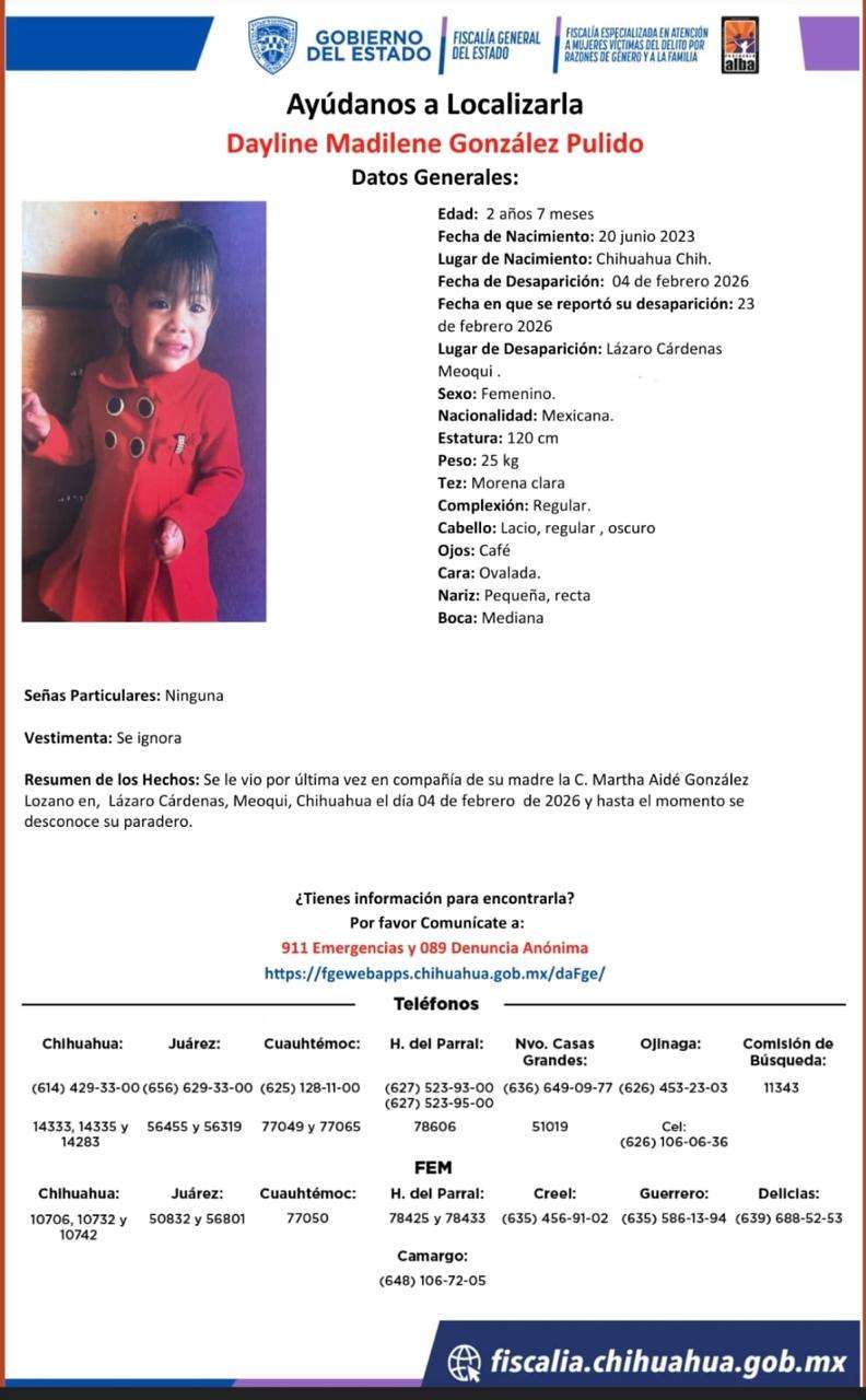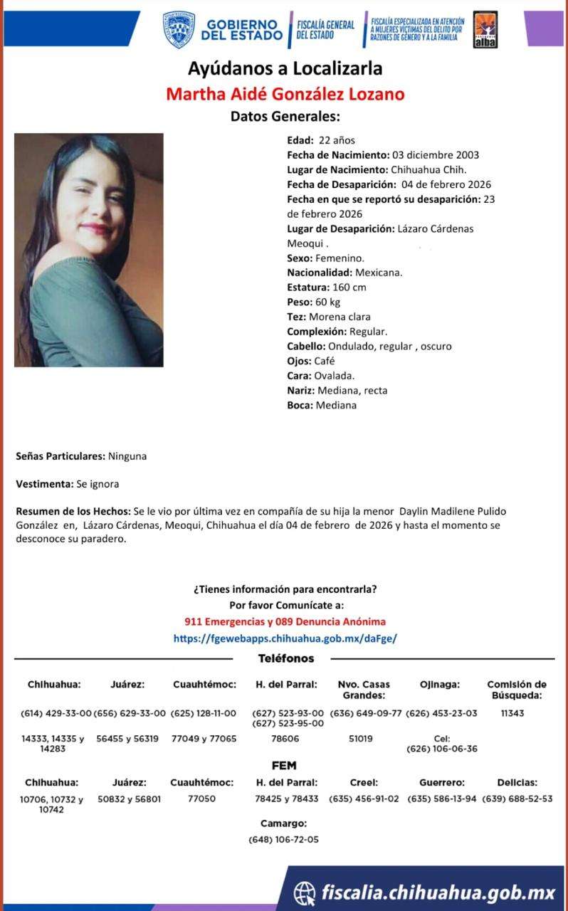 Meoqui, Chih.– Autoridades solicitan el apoyo de la ciudadanía para localizar a Martha Aidé González Lozano, de 22 años de edad, y a su hija Dayline Madilene González Pulido, de 2 años, quienes fueron reportadas como desaparecidas el pasado 4 de febrero en la localidad de Lázaro Cárdenas, municipio de Meoqui.