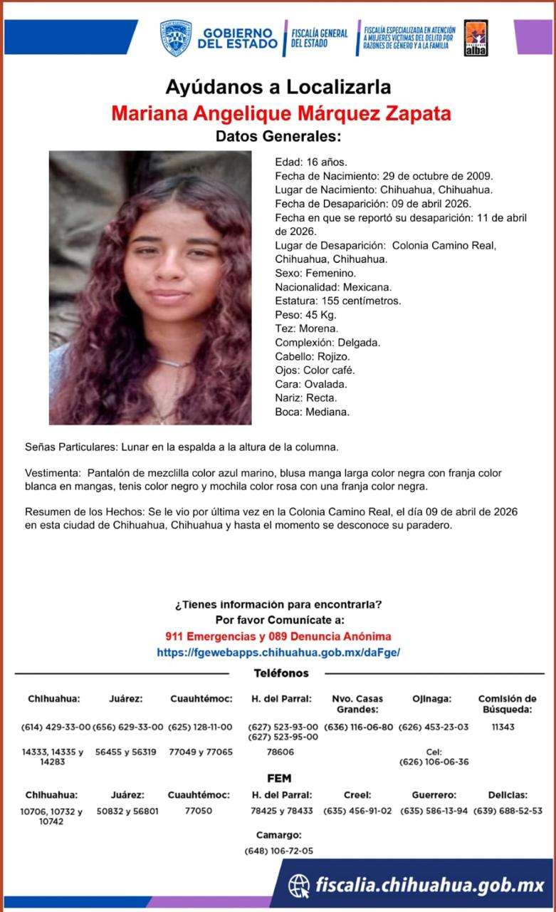 Chihuahua. – La Fiscalía General del Estado de Chihuahua, solicita la colaboración ciudadana para localizar a la menor Mariana Angelique Márquez Zapata, de 16 años de edad, quien fue reportada como desaparecida el pasado 11 de abril de 2026.