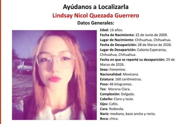 Chihuahua. - La Fiscalía General del Estado emitió una pesquisa urgente para localizar a Lindsay Nicol Quezada Guerrero, de 16 años de edad, quien fue vista por última vez el pasado 28 de marzo de 2026 en la colonia Esperanza, en la capital del estado.
