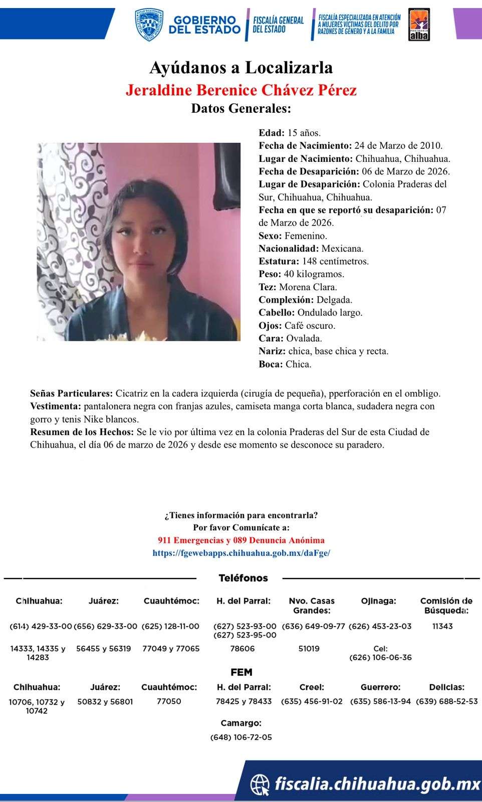 Chihuahua. - Familiares solicitan el apoyo de la ciudadanía para localizar a Jeraldine Berenice Chávez Pérez, de 15 años de edad, quien desapareció el pasado 6 de marzo en la colonia Praderas del Sur, en la ciudad de Chihuahua.