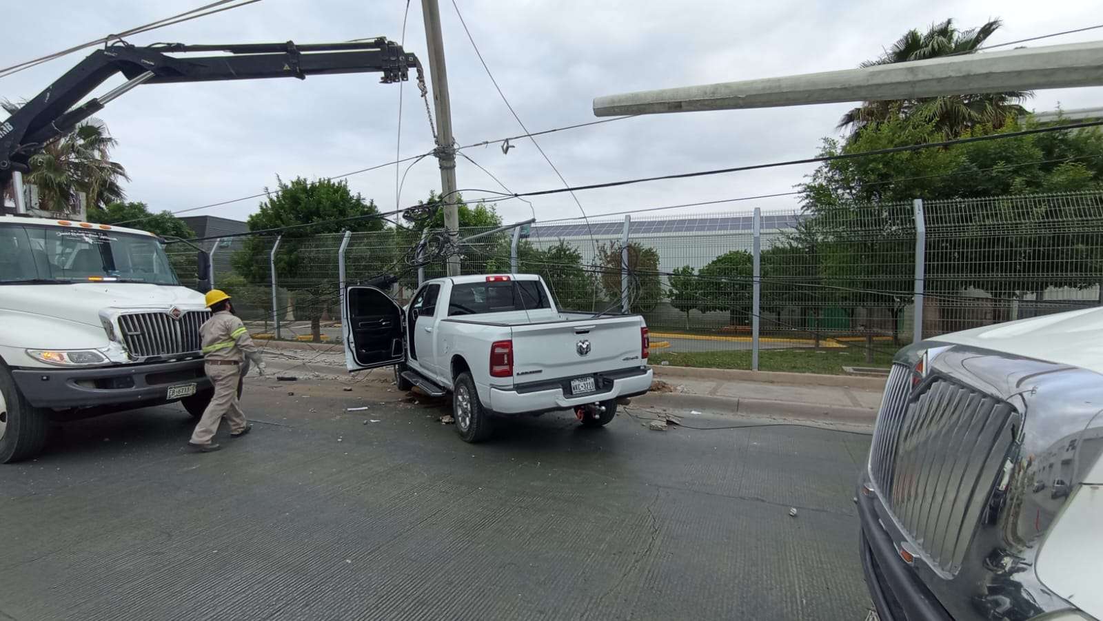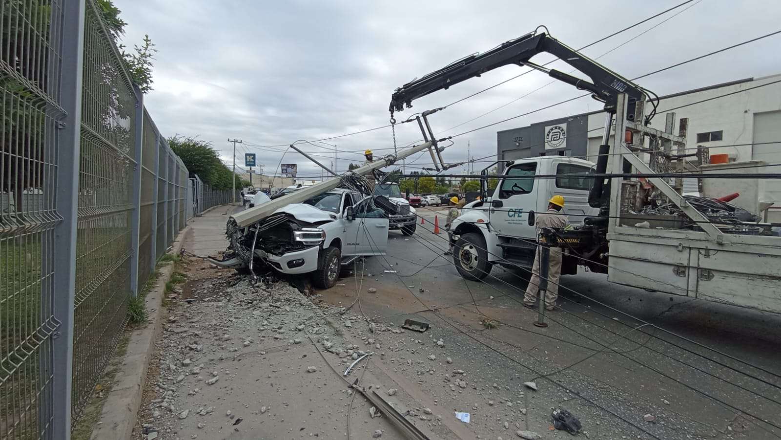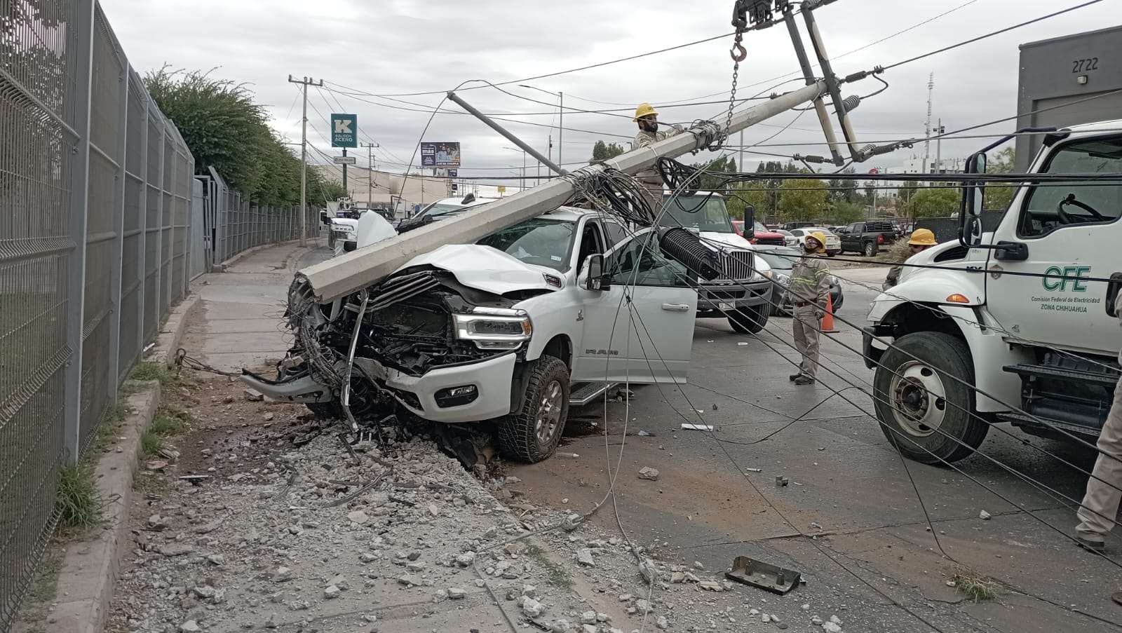 Chihuahua. - Un fuerte accidente vial se registró sobre la Vialidad Ch-P, a la altura de la calle Esmeralda, donde el conductor de una camioneta de reciente modelo derribó un poste de la Comisión Federal de Electricidad (CFE), dejando sin suministro eléctrico a las empresas de la zona industrial.