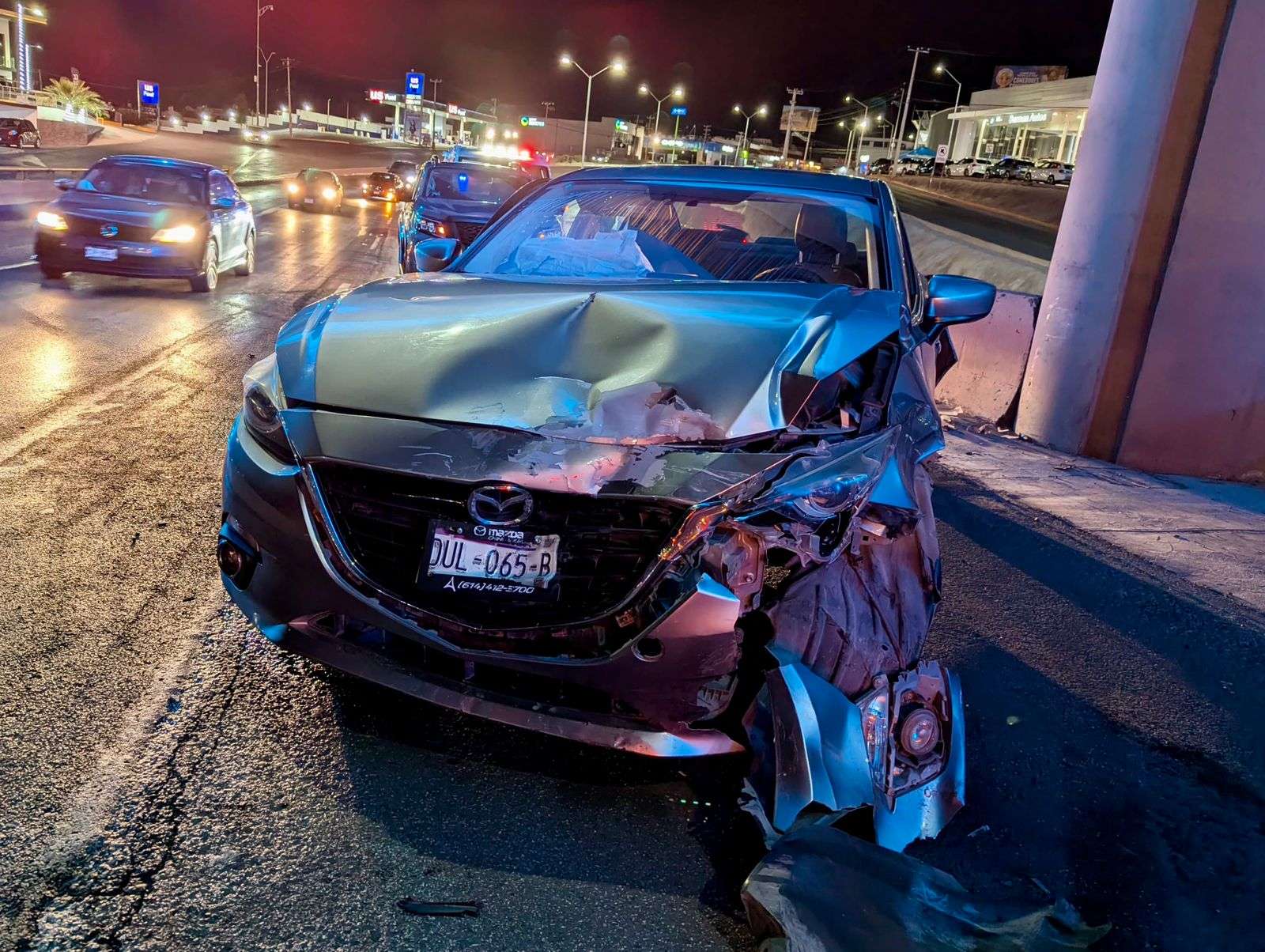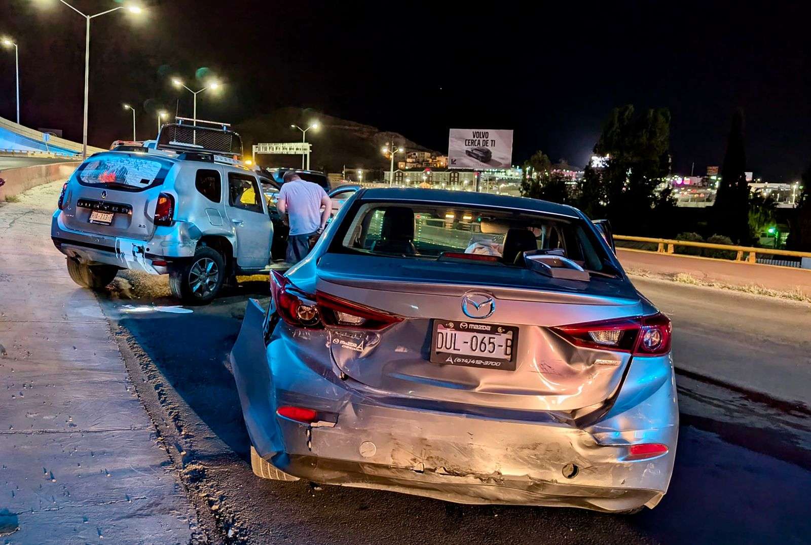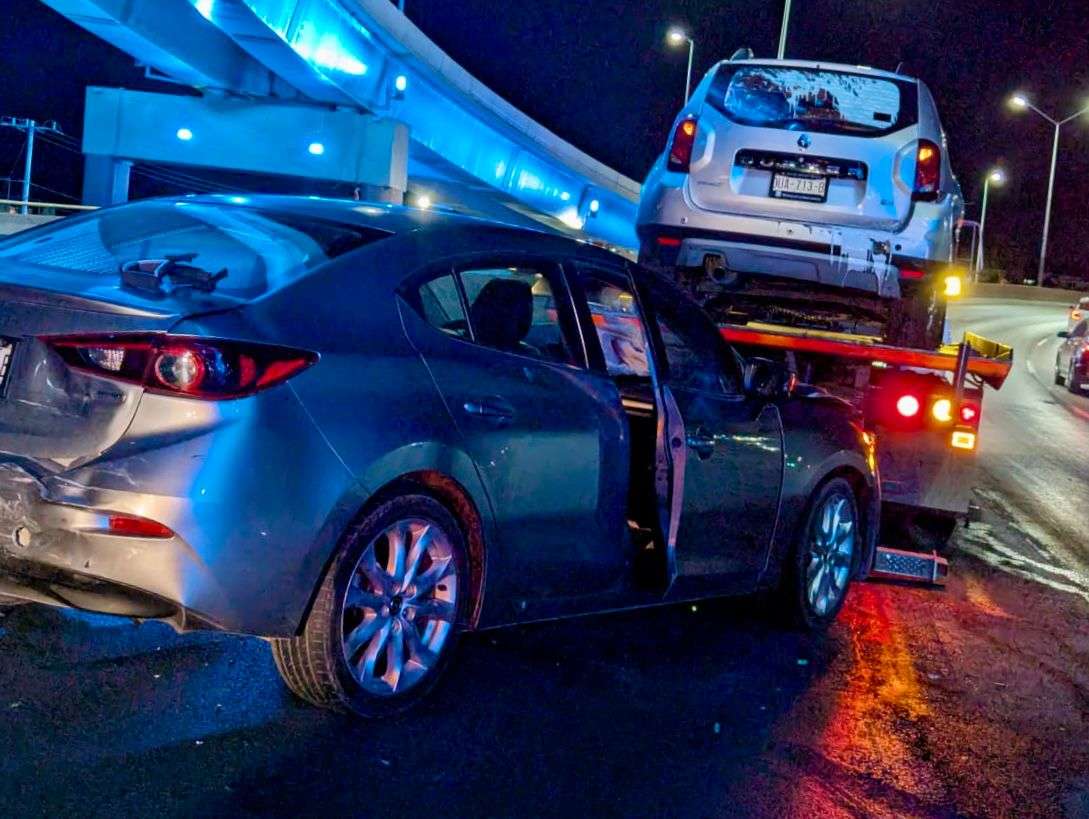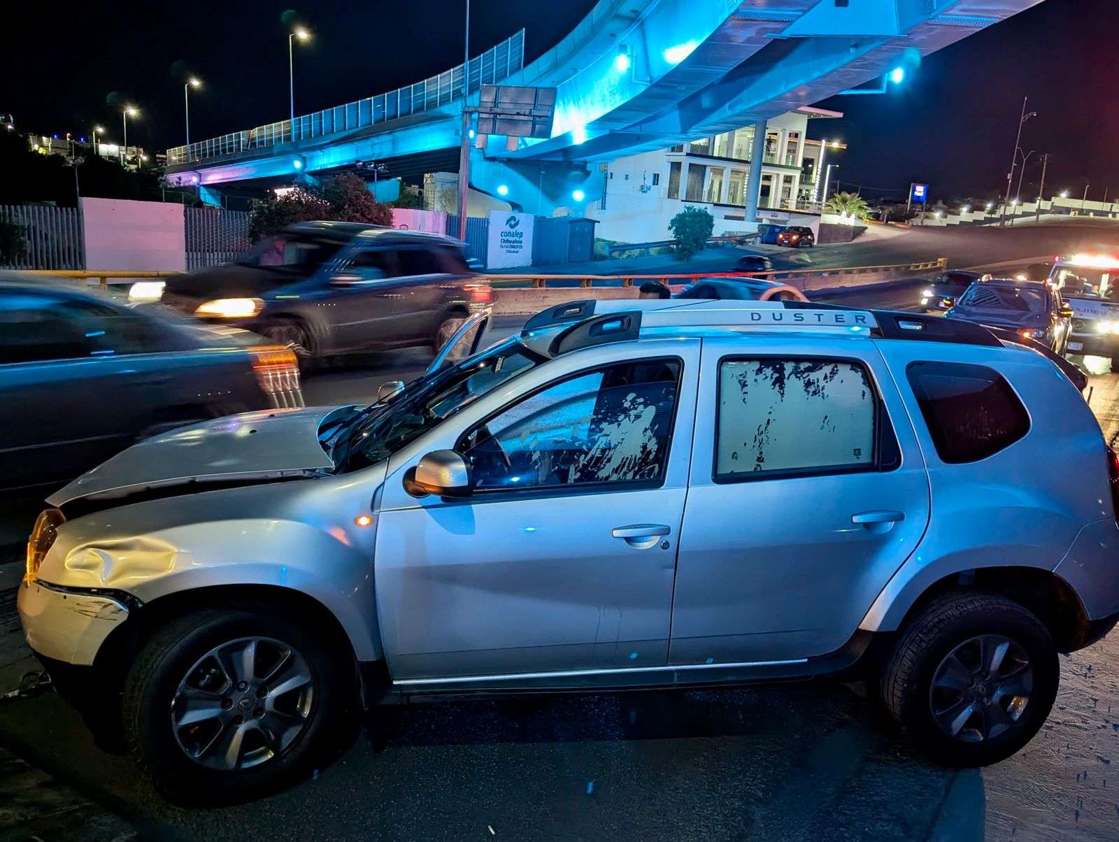 El accidente ocurrió en el carril lateral, en sentido de sur a norte, justo debajo de la gaza que conecta con la avenida La Cantera. De acuerdo con el reporte de la Policía Vial, el conductor de un vehículo Mazda impactó por la parte trasera a una camioneta Renault Duster.