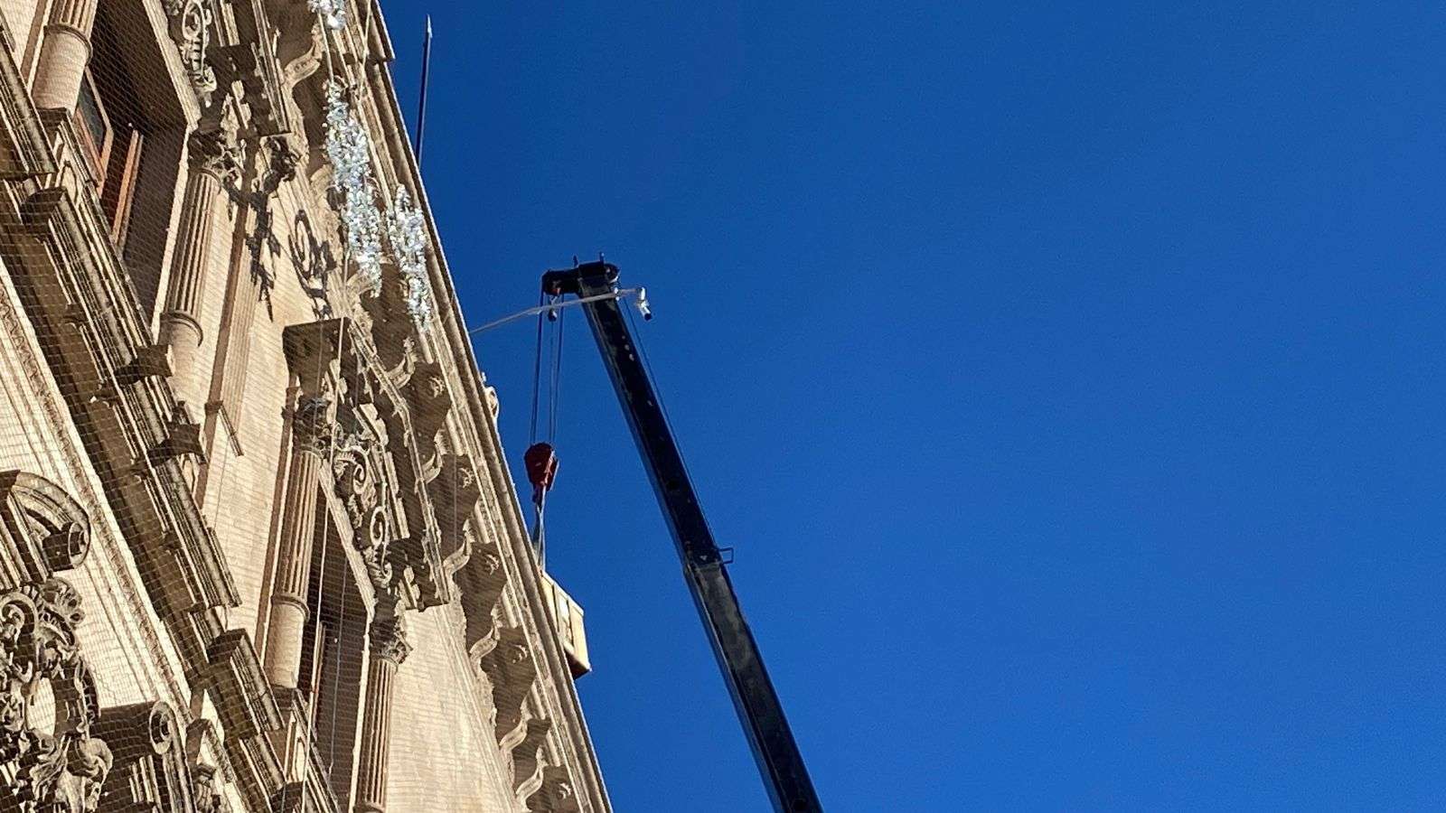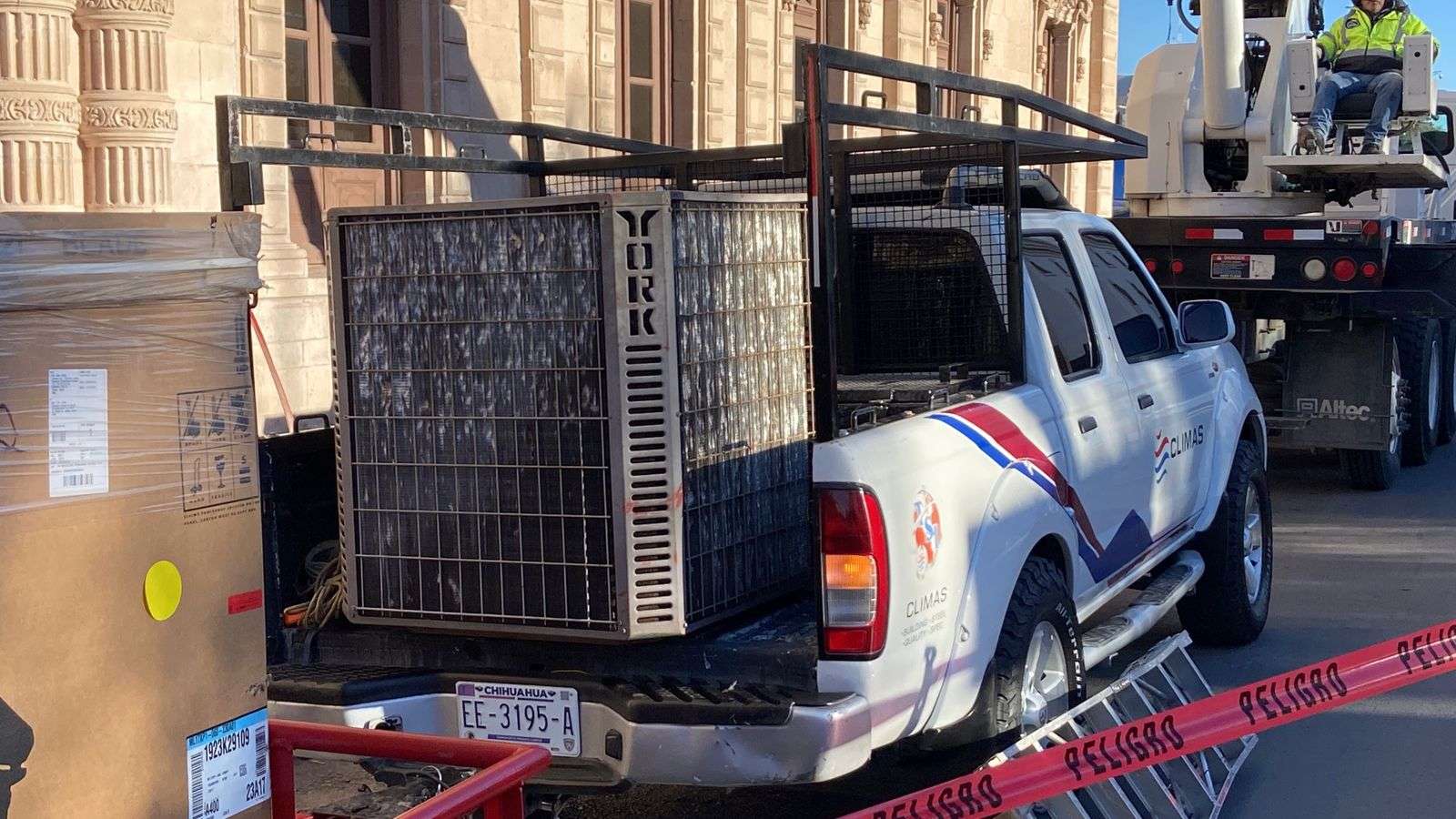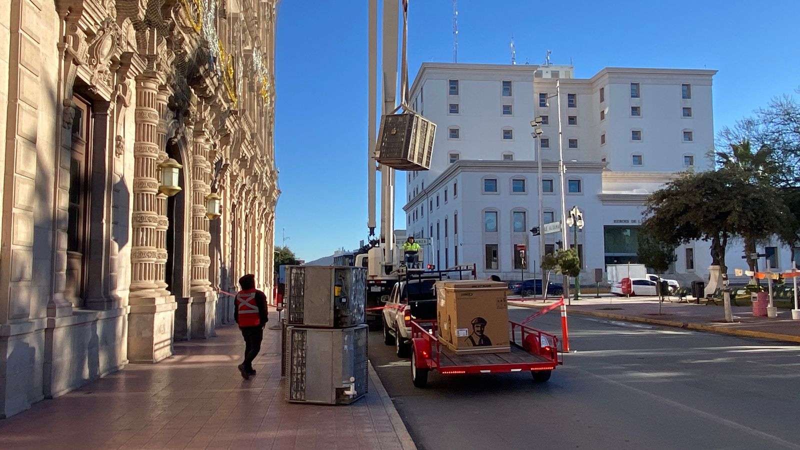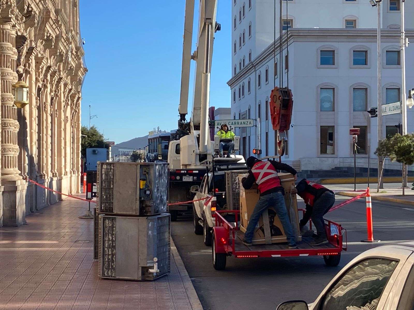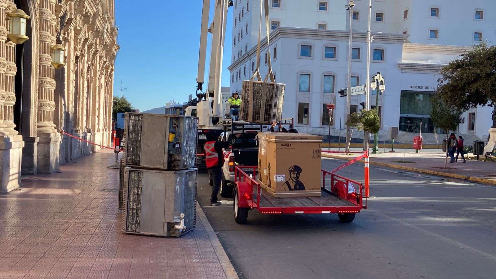Chihuahua.- Una grúa y personal del Gobierno cerraron un carril y medio de la calle Aldama para bajar los aires acondicionados que serán sustituidos en el Palacio de Gobierno.