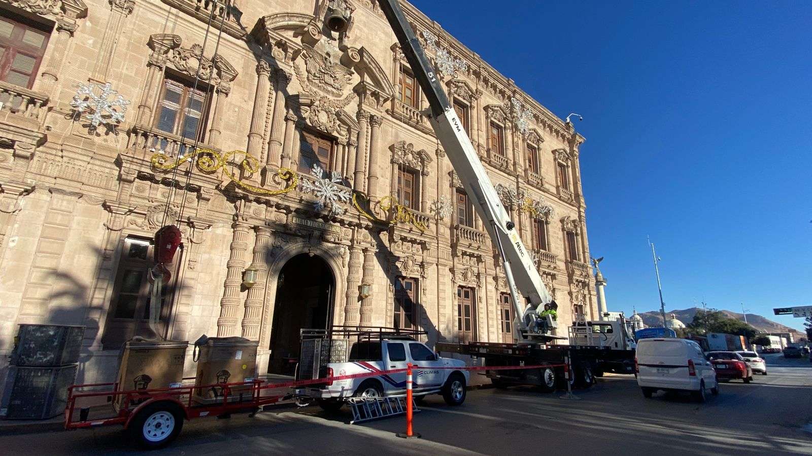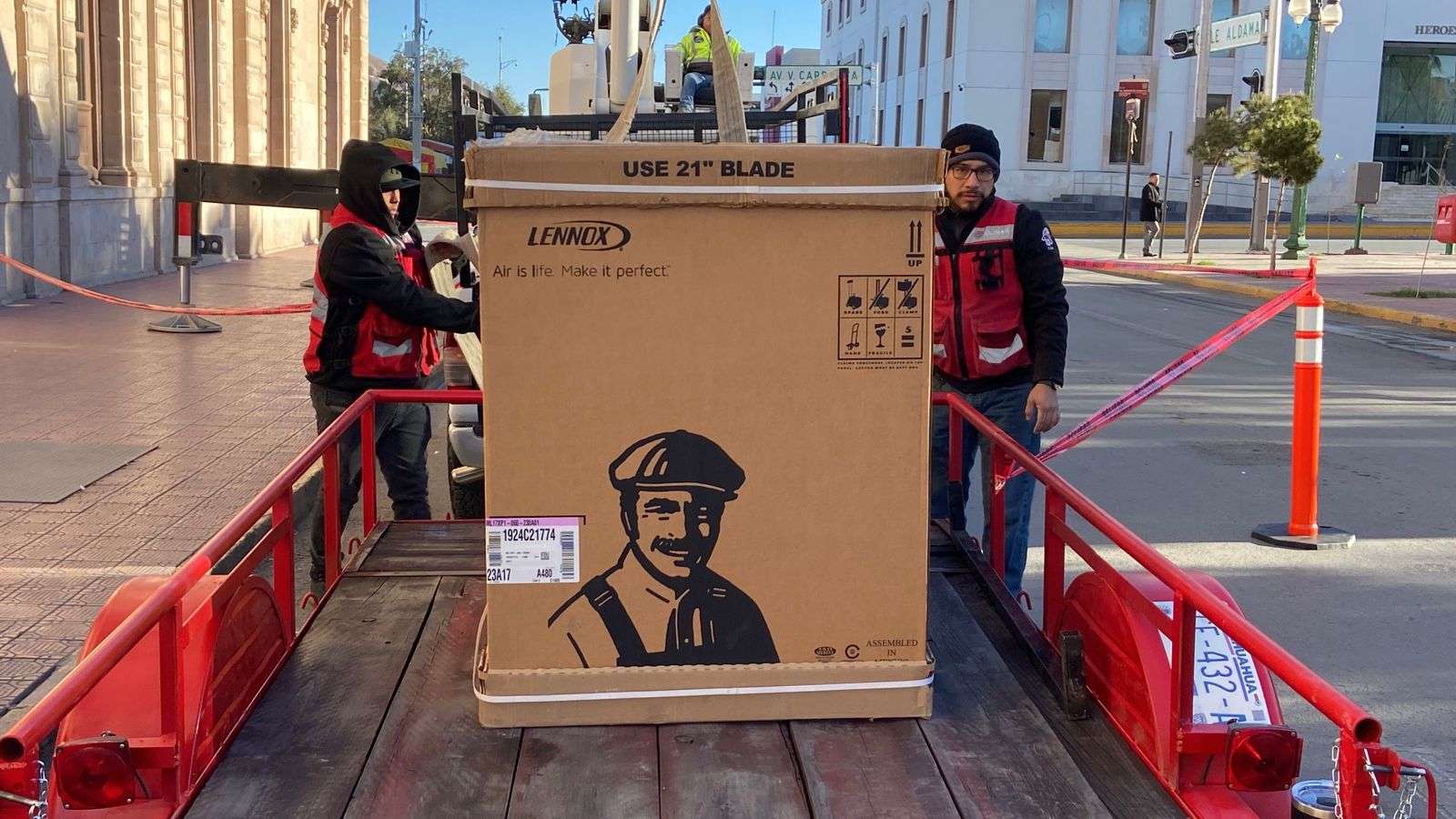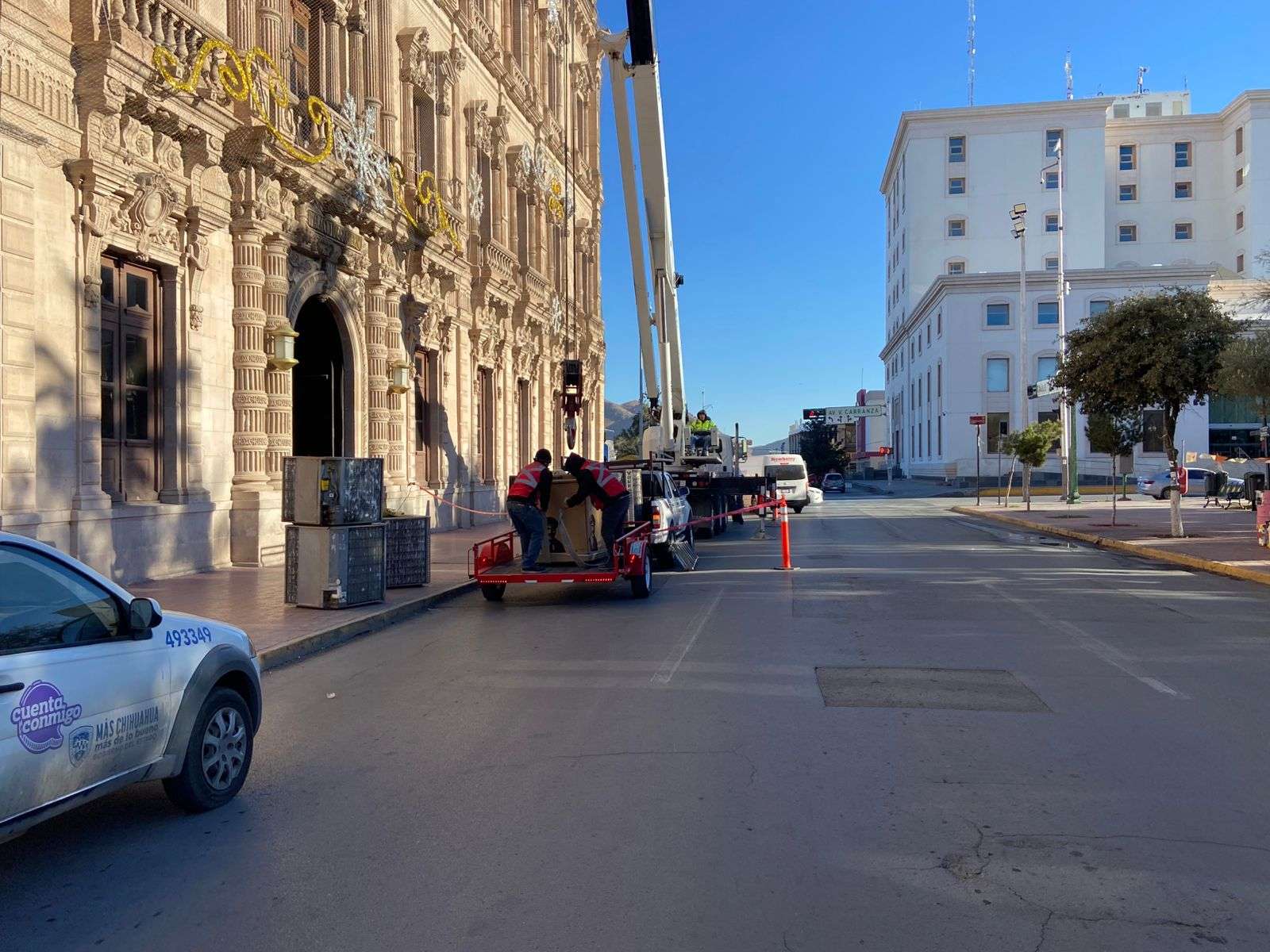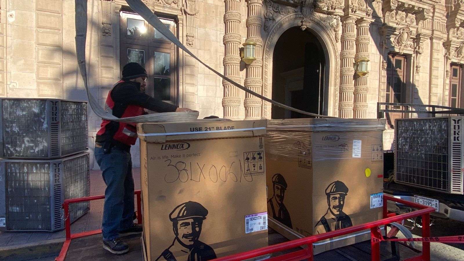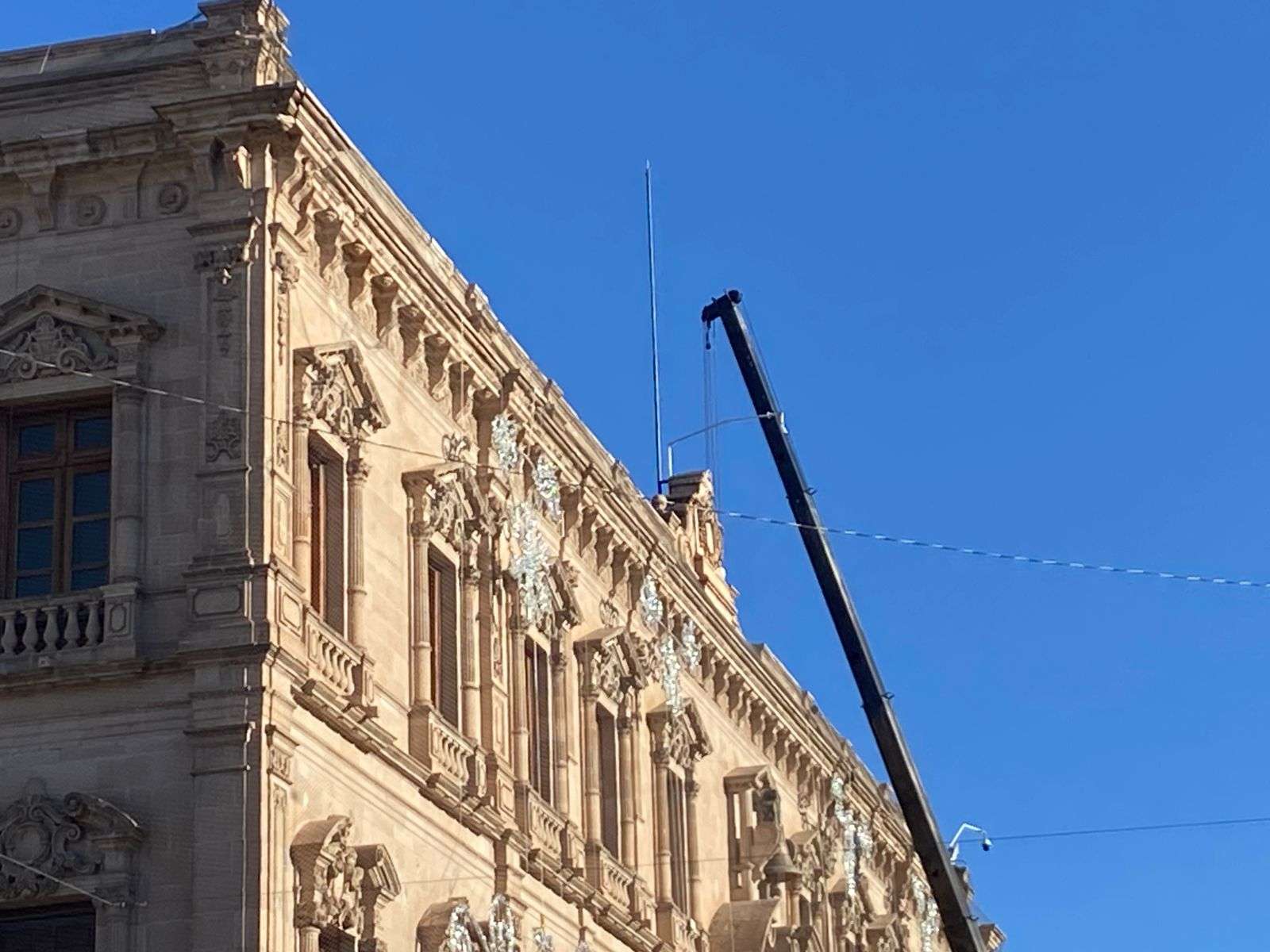 Chihuahua.- Una grúa y personal del Gobierno cerraron un carril y medio de la calle Aldama para bajar los aires acondicionados que serán sustituidos en el Palacio de Gobierno.
