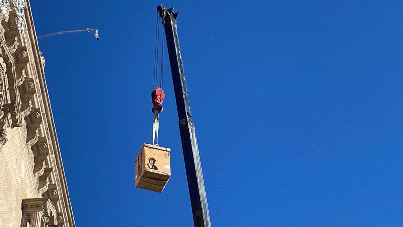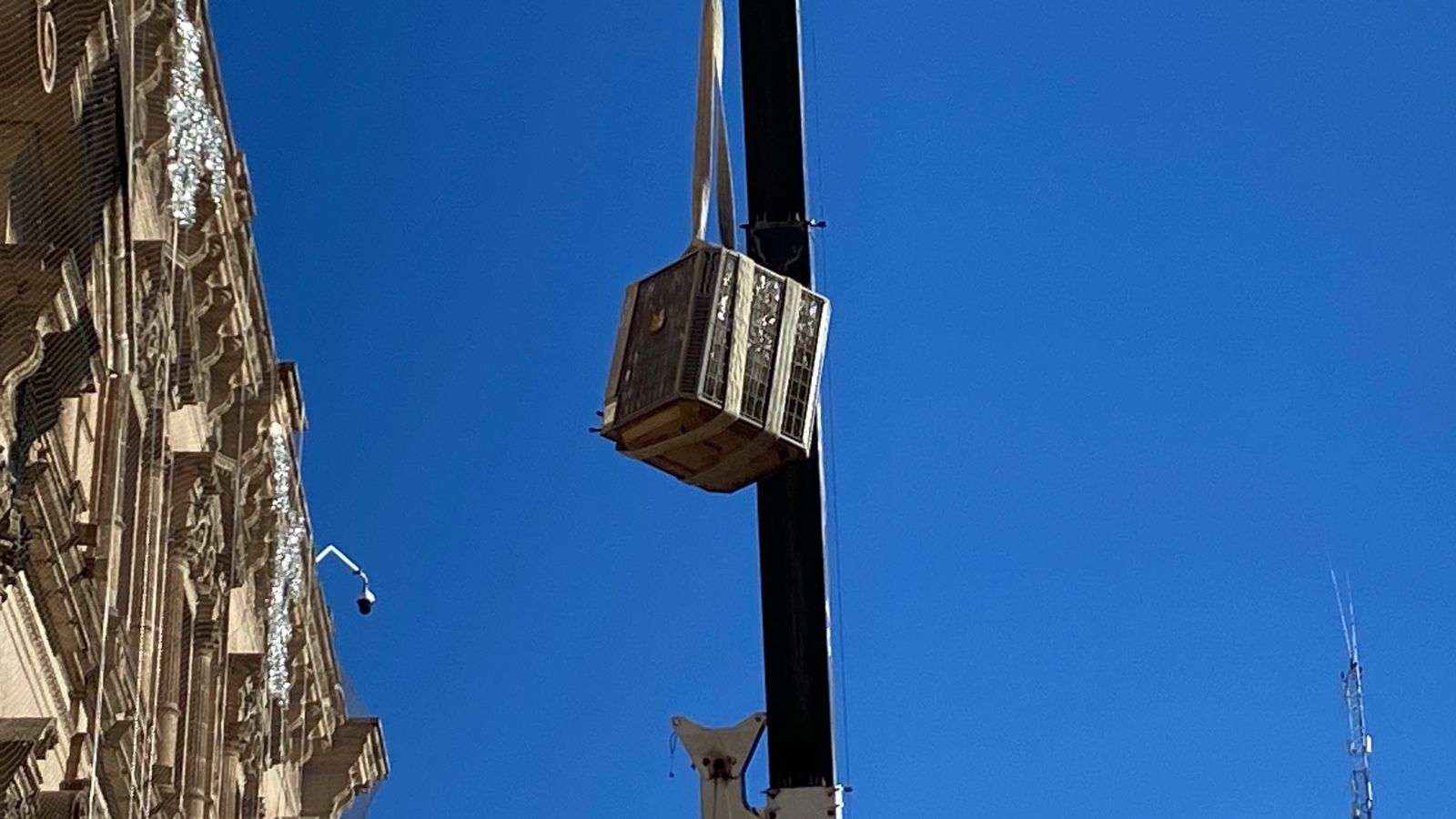 La grúa se colocó justo enfrente de la puerta principal del edificio de cantera para facilitar la subida de los aires al techo y su posterior instalación, ya que los anteriores se encontraban muy deteriorados.