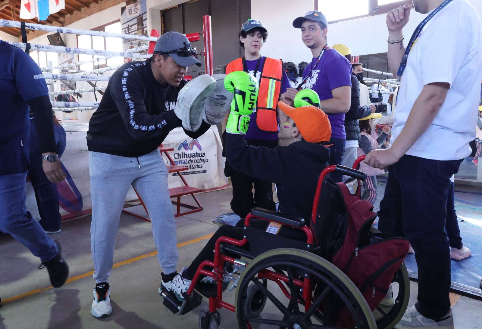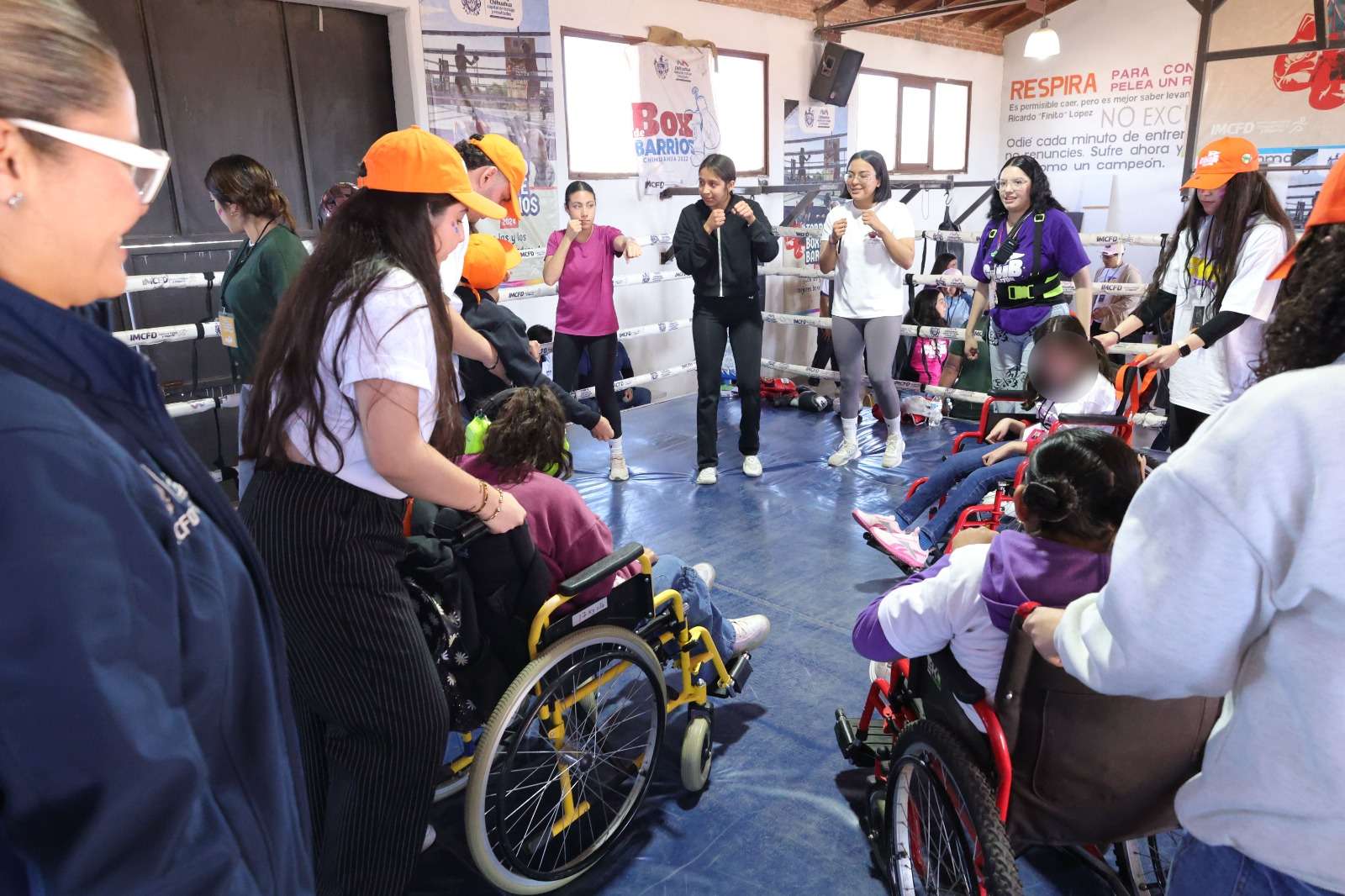 Durante la sesión, las niñas y niños, con distintas condiciones de discapacidad, participaron en circuitos de activación y ejercicios básicos de boxeo, interactuando con costales, guantes y viviendo la motivadora experiencia de subir al ring, en un entorno de respeto, entusiasmo y acompañamiento.