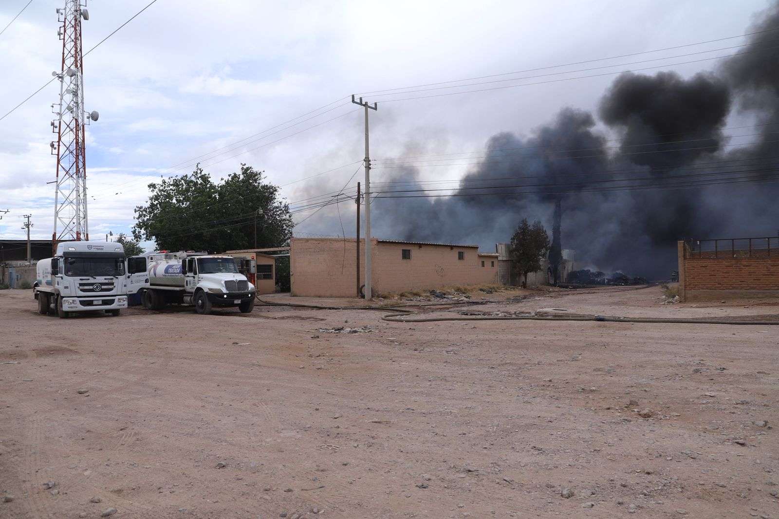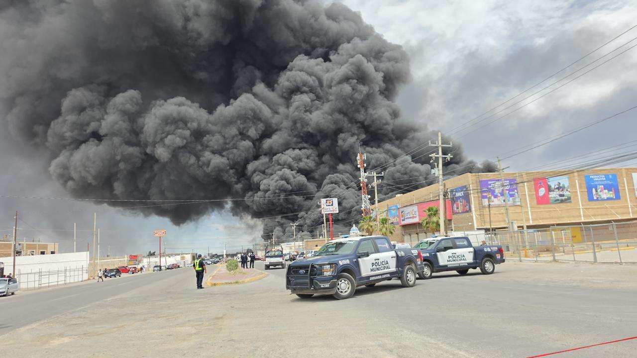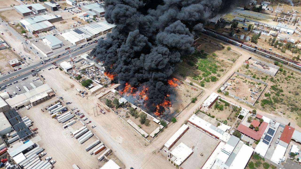 Chihuahua, Chih.- La tarde de este domingo personal del H. Cuerpo de Bomberos se encuentra atendiendo y trabajando en la sofocacion total del incendio registrado en la empresa Procesadora y Recicladora de Materiales Industriales, ubicada en las calles Sierra de la Cal y calle 57, en la colonia Primero de Mayo, donde se almacenaban cerca de 160 toneladas de plástico.