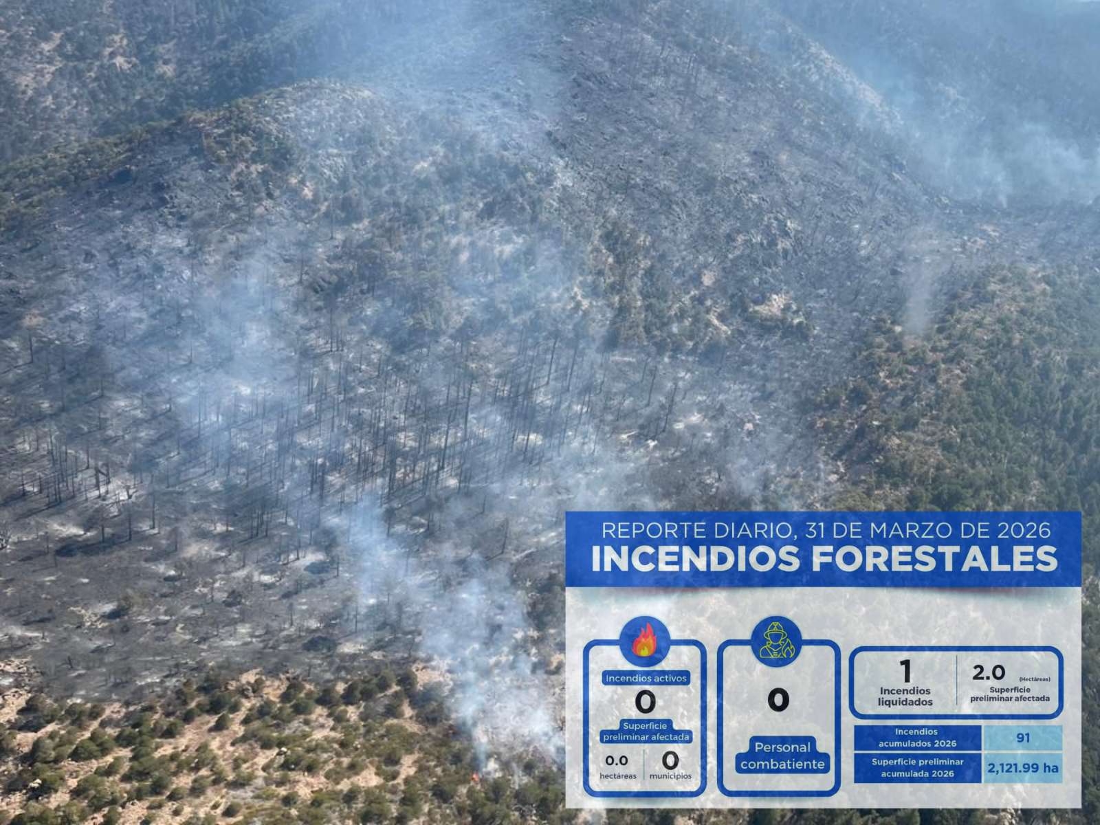 Con este reporte, las estadísticas oficiales indican que en lo que va del año se han registrado un total de 91 incendios forestales en el territorio estatal, acumulando una superficie afectada de 2 mil 121 hectáreas.