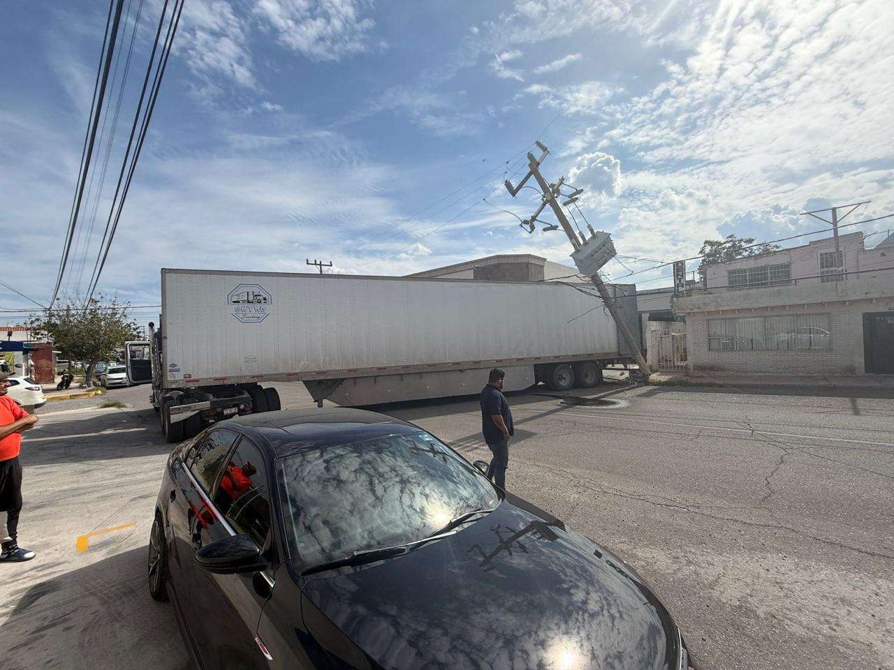 El percance ocurrió en la intersección de la calle 23 y la privada de José Eligio Muñoz, donde el conductor de un camión de transporte de materiales de la empresa Chuntaros Trucking, procedente de Ciudad Juárez, se enredó con el cableado al realizar una maniobra.