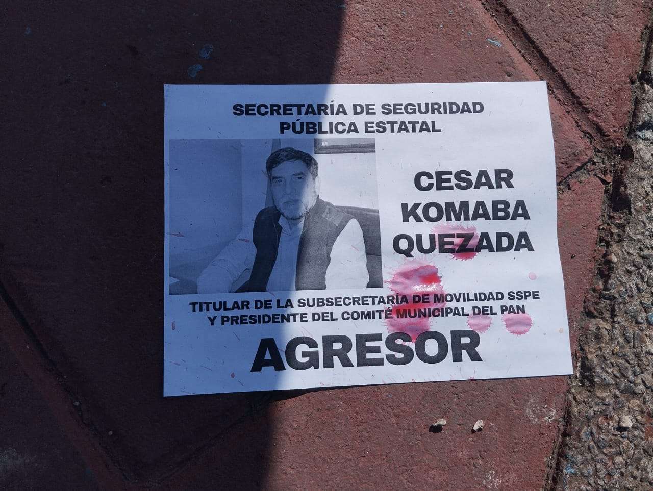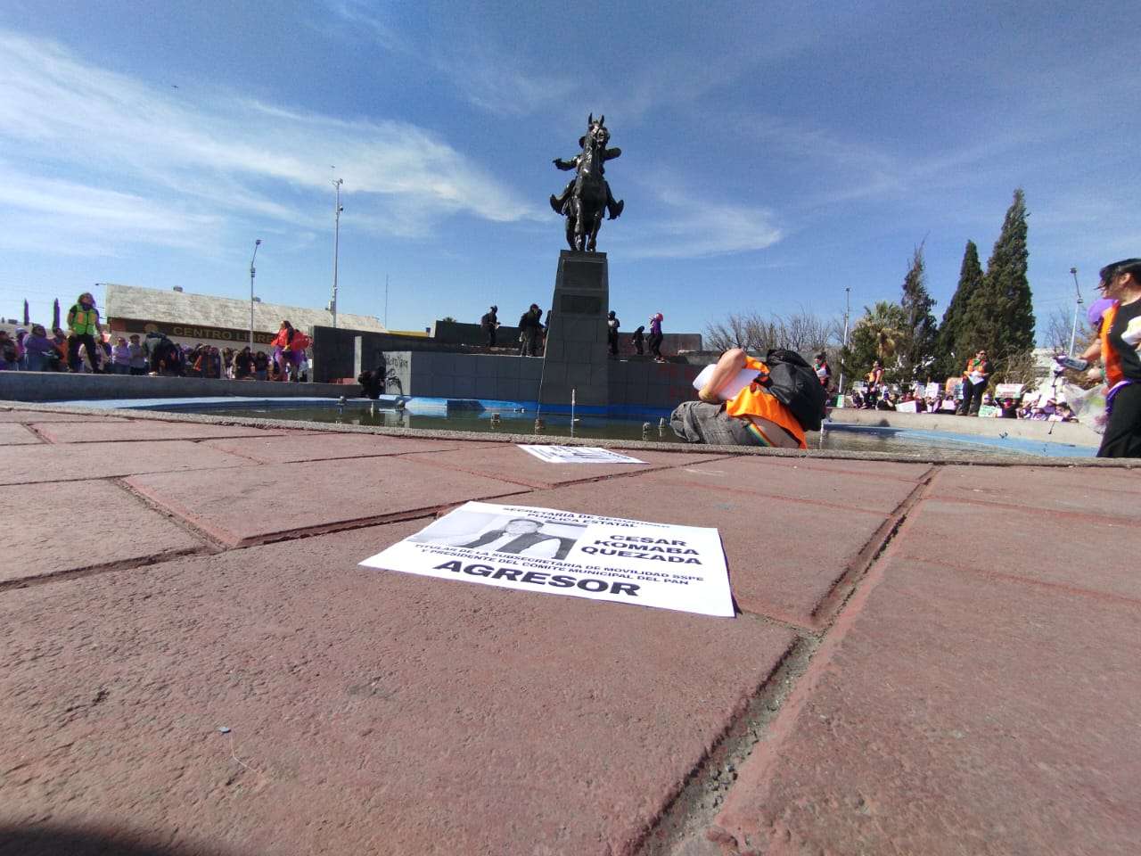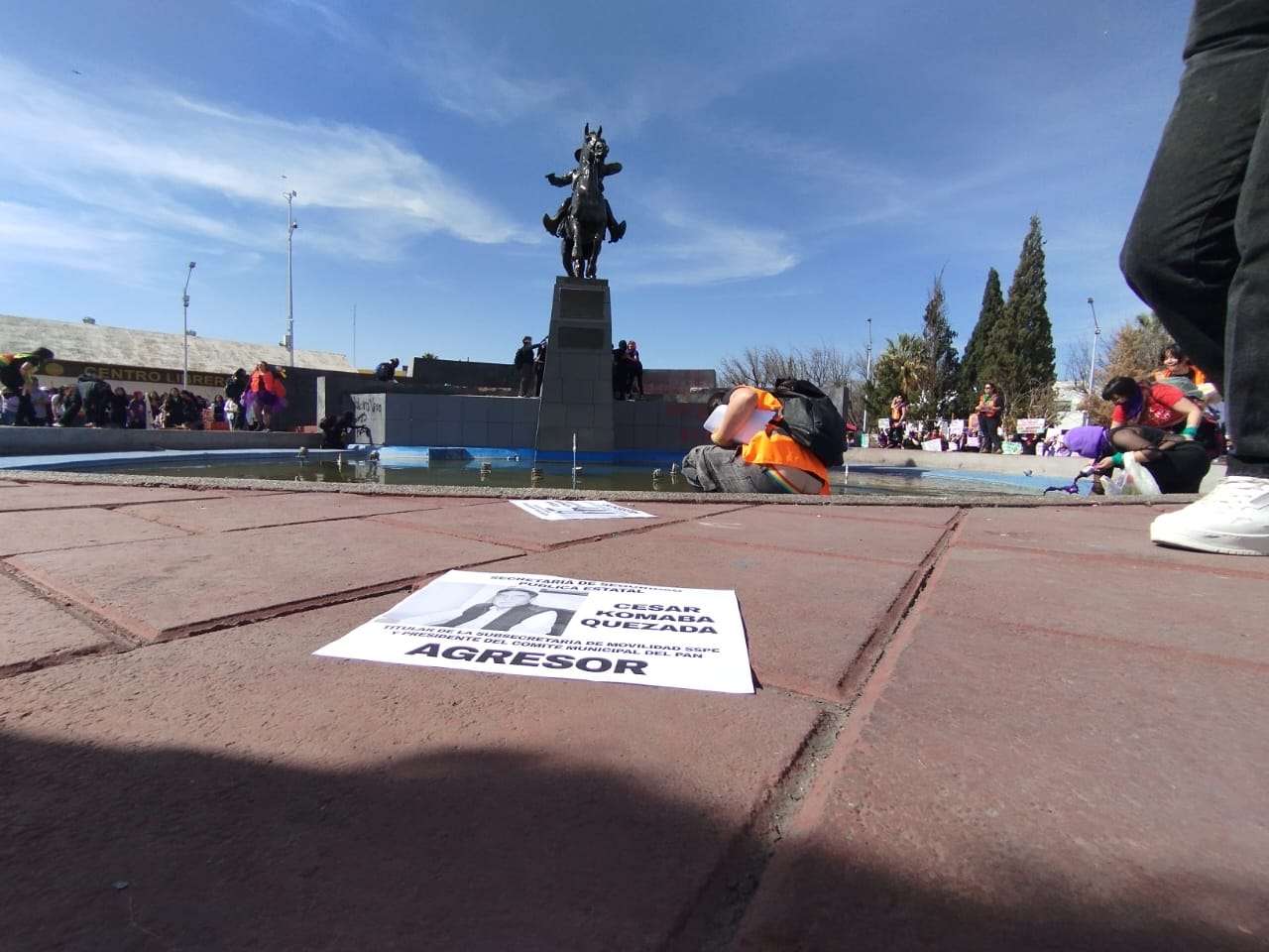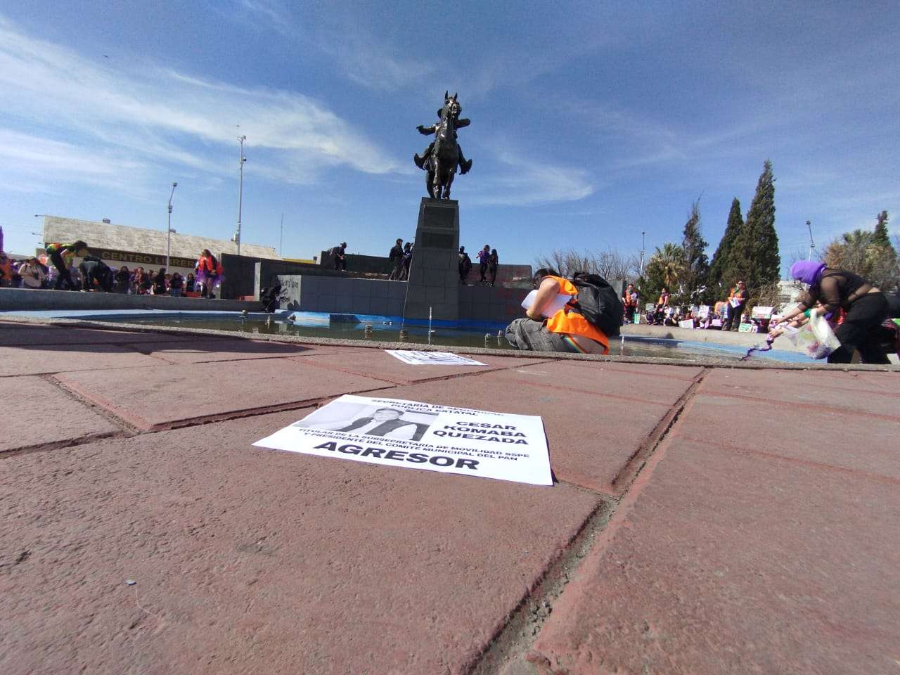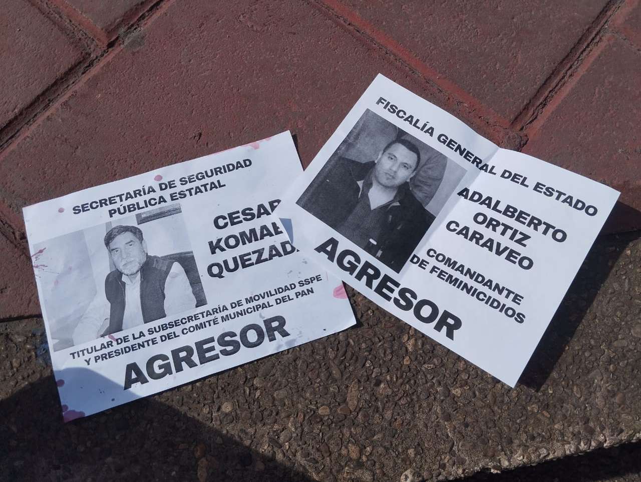 Las manifestantes utilizaron el espacio para visibilizar denuncias en contra del secretario de Seguridad Pública Estatal, César Komba Quezada, y del comandante del área de feminicidios de la Fiscalía General del Estado, Adalberto Ortiz Caraveo.