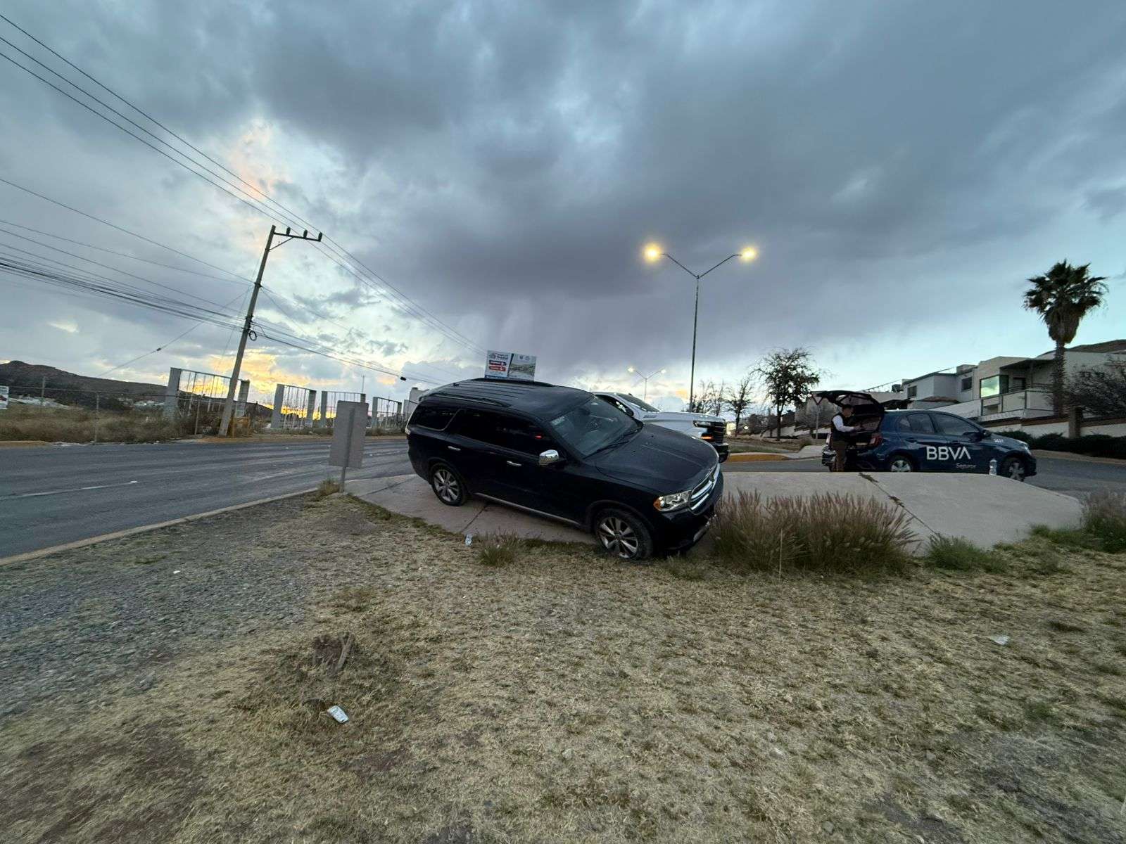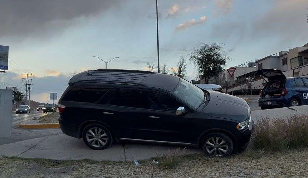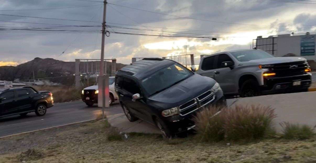 Chihuahua. – La conductora de una camioneta Durango protagonizó un percance vial este viernes al derrapar sobre el asfalto mojado de la Vialidad La Cantera. El incidente ocurrió cuando circulaba en sentido de oeste a este, perdiendo el control de la unidad poco antes de llegar al cruce con la avenida Tomás Valles.