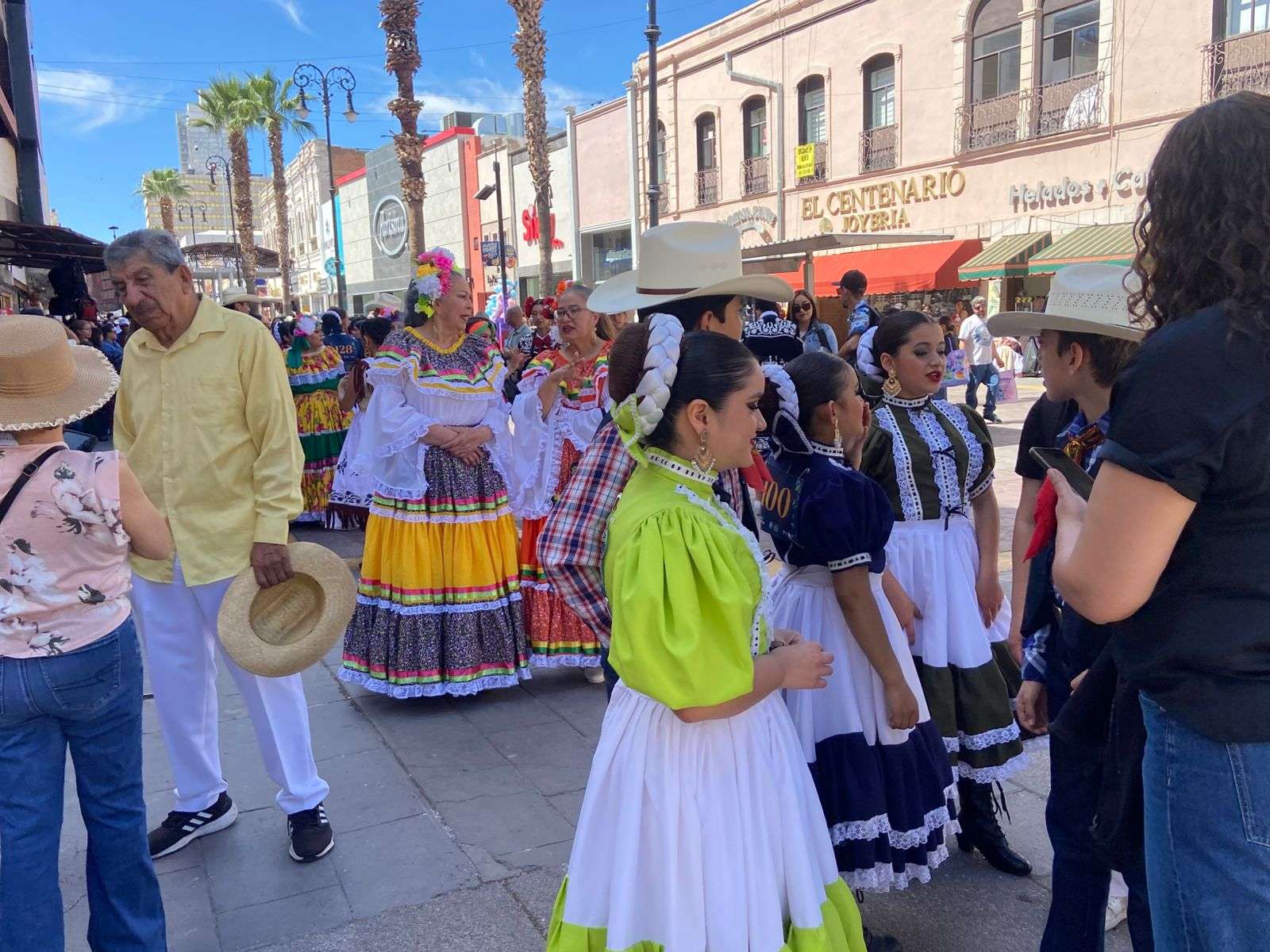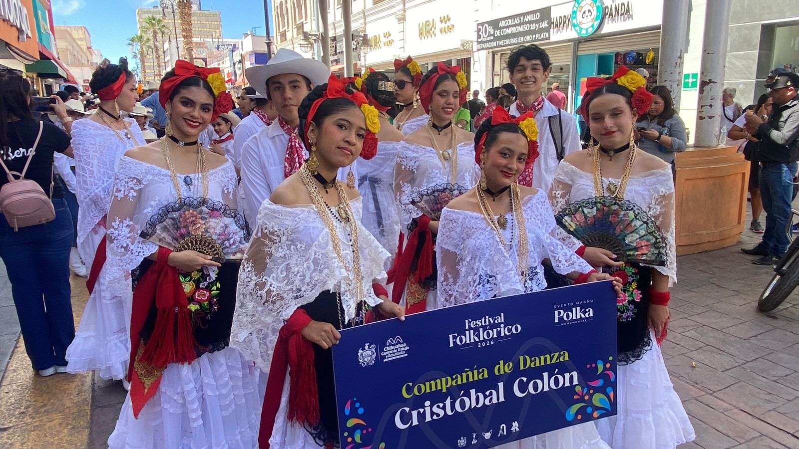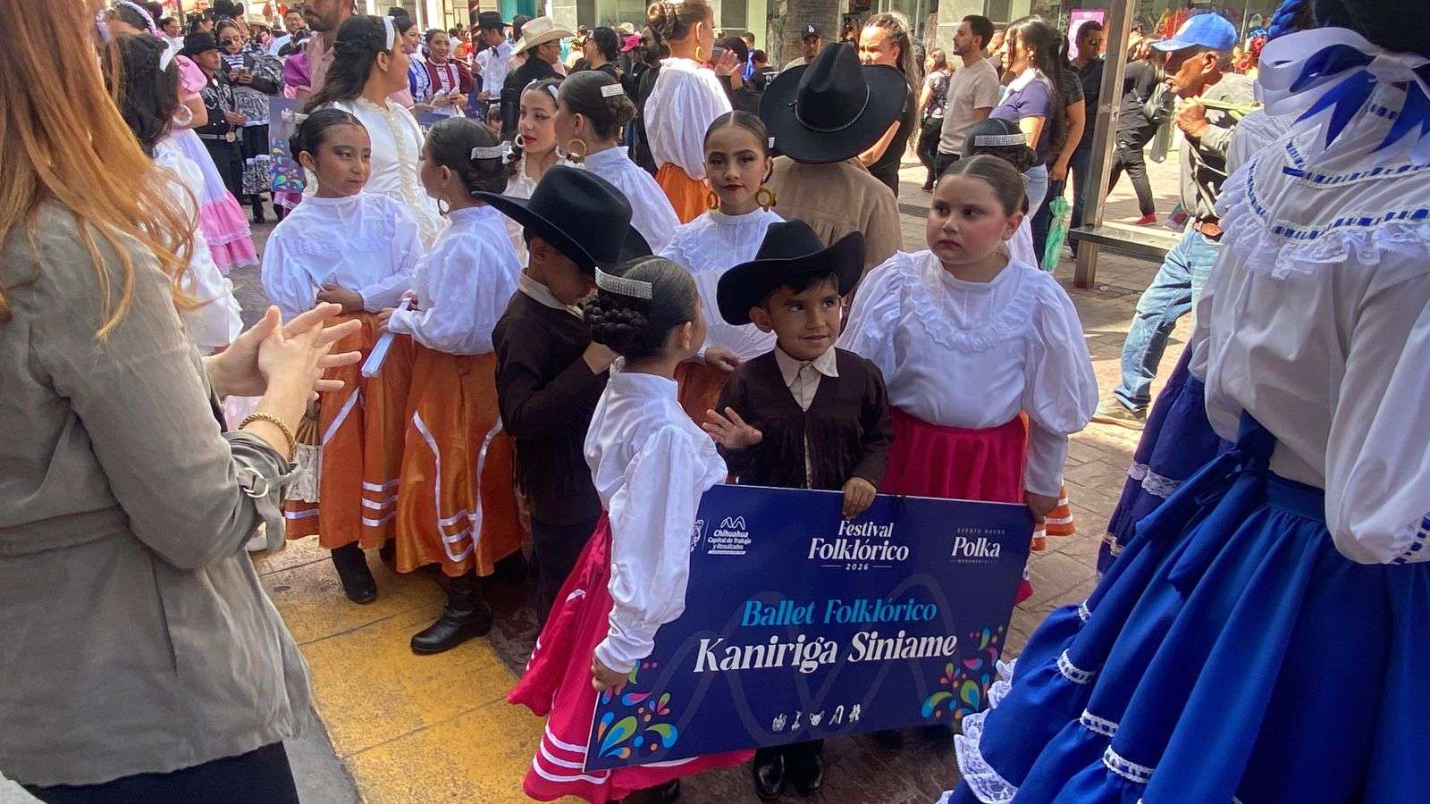Chihuahua.- Un ambiente festivo y lleno de música inundó las calles del centro de la capital con el desfile de más de 70 grupos de danza que participaron en el Festival Folclórico en la Plaza de Armas.