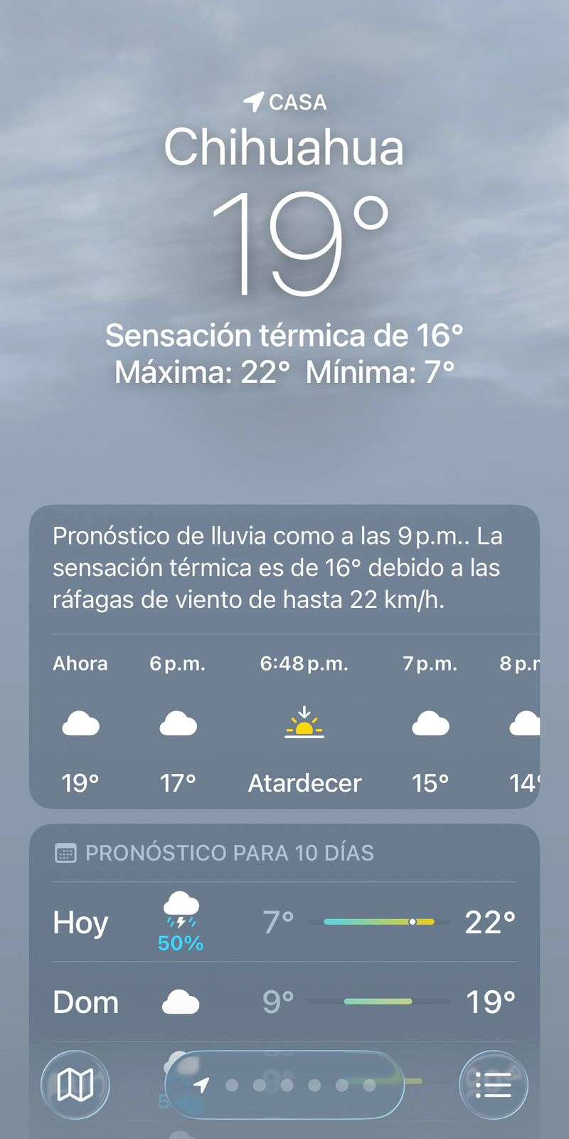 La temperatura durante esta hora de la tarde es de 19 grados con una sensación térmica de 16 grados.