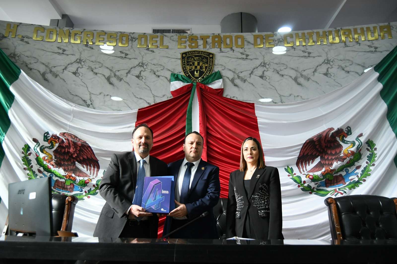 Chihuahua. - Este domingo 01 de marzo a las 09:30 horas, el secretario general del Estado, Santiago de la Peña, en representación de la gobernadora María Eugenia Campos Galván hizo la entrega del documento oficial de su Cuarto Informe de Gobierno al presidente del Poder Legislativo, Guillermo "Memo" Ramírez en el Congreso del Estado.