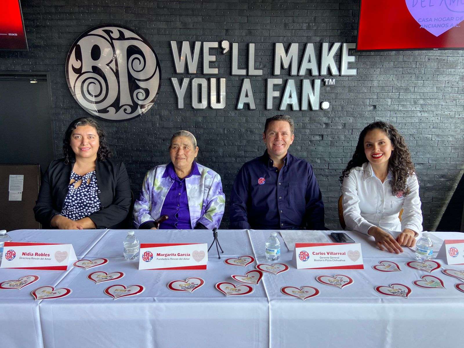 La señora Margarita García, quien es fundadora de esta Casa Hogar recibió de manos del gerente general de Boston's Pizza Carlos Villarreal y de Ana Castillo Gerente de Marketing el cheque del donativo.